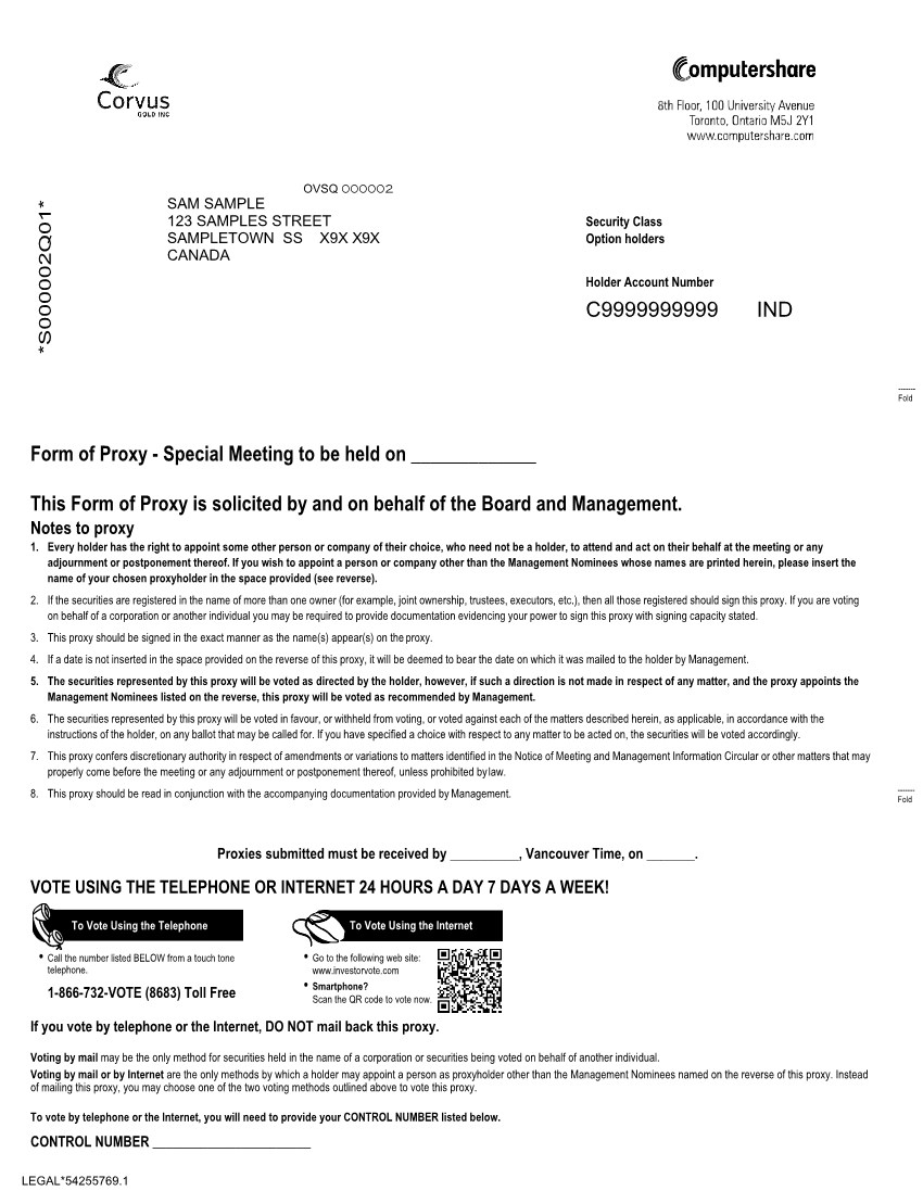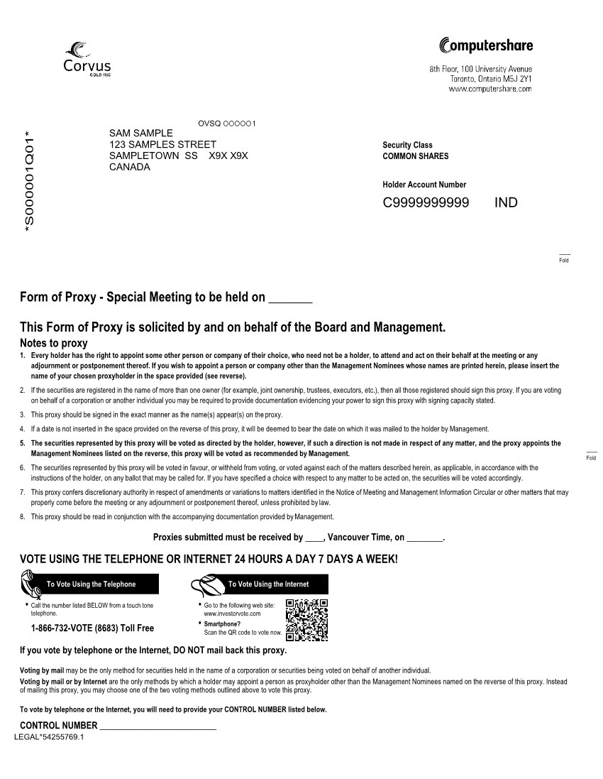 Registered Securityholders of Corvus are requested to complete and return the enclosed form of proxy to ensure that your securities will be represented at the Special Meeting, whether or not you are personally able to attend. Please complete the enclosed form of proxy and submit it to our transfer agent and registrar, Computershare Investor Services Inc., as soon as possible but not later than [●] (Vancouver time) on [●], 2021 or 48 hours (excluding weekends and holidays) prior to the time of any adjournment or postponement of the Special Meeting.
