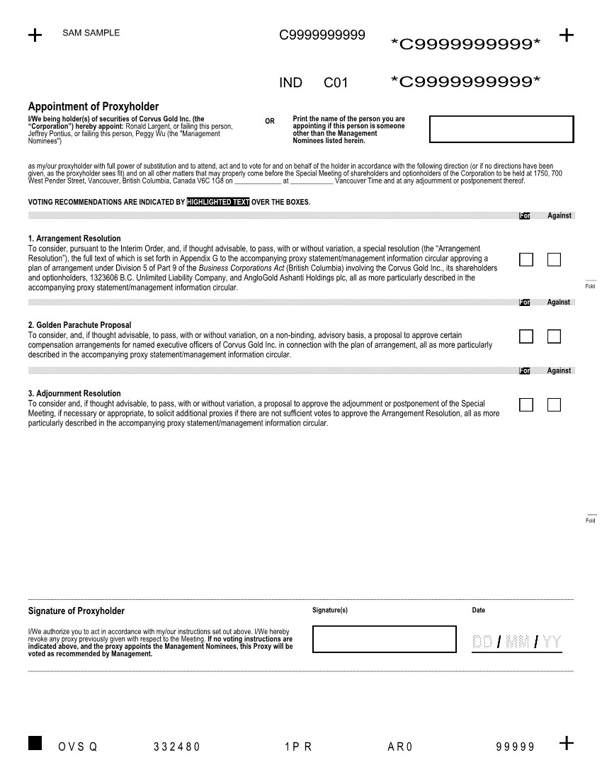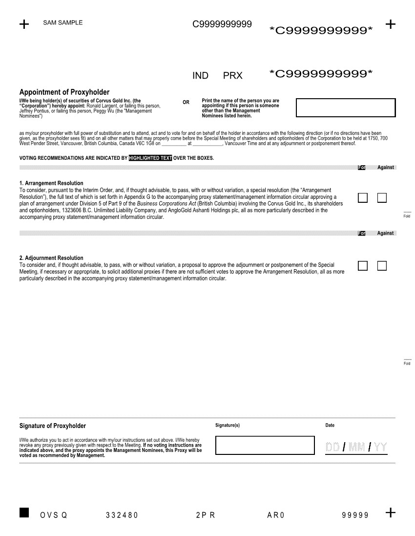 | 1. | to consider, pursuant to the Interim Order, and, if thought advisable, to pass, with or without variation, a special resolution (the “Arrangement Resolution”), the full text of which is set forth in Appendix F to the accompanying proxy statement/management information circular of the Company (the “Circular”), approving a plan of arrangement under Division 5 of Part 9 of the Business Corporations Act (British Columbia) (the “BCBCA”) involving the Company, its shareholders and optionholders, 1323606 B.C. Unlimited Liability Company, an unlimited liability company existing under the laws of British Columbia (the “Purchaser”) and AngloGold Ashanti Holdings plc, a public limited company existing under the laws of the Isle of Man (the “Guarantor”) (the “Plan of Arrangement”) pursuant to which the Purchaser will, among other things, acquire all of the issued and outstanding common shares of the Company (other than the common shares already owned by the Guarantor and its affiliates), all as more particularly described in the Circular; |