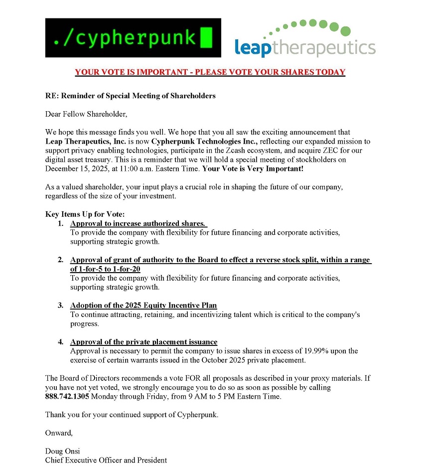 ![]() | YOUR VOTE IS IMPORTANT - PLEASE VOTE YOUR SHARES TODAY RE: Reminder of Special Meeting of Shareholders Dear Fellow Shareholder, We hope this message finds you well. We hope that you all saw the exciting announcement that Leap Therapeutics, Inc. is now Cypherpunk Technologies Inc., reflecting our expanded mission to support privacy enabling technologies, participate in the Zcash ecosystem, and acquire ZEC for our digital asset treasury. This is a reminder that we will hold a special meeting of stockholders on December 15, 2025, at 11:00 a.m. Eastern Time. Your Vote is Very Important! As a valued shareholder, your input plays a crucial role in shaping the future of our company, regardless of the size of your investment. Key Items Up for Vote: 1. Approval to increase authorized shares. To provide the company with flexibility for future financing and corporate activities, supporting strategic growth. 2. Approval of grant of authority to the Board to effect a reverse stock split, within a range of 1-for-5 to 1-for-20 To provide the company with flexibility for future financing and corporate activities, supporting strategic growth. 3. Adoption of the 2025 Equity Incentive Plan To continue attracting, retaining, and incentivizing talent which is critical to the company's progress. 4. Approval of the private placement issuance Approval is necessary to permit the company to issue shares in excess of 19.99% upon the exercise of certain warrants issued in the October 2025 private placement. The Board of Directors recommends a vote FOR all proposals as described in your proxy materials. If you have not yet voted, we strongly encourage you to do so as soon as possible by calling 888.742.1305 Monday through Friday, from 9 AM to 5 PM Eastern Time. Thank you for your continued support of Cypherpunk. Onward, Doug Onsi Chief Executive Officer and President |