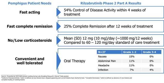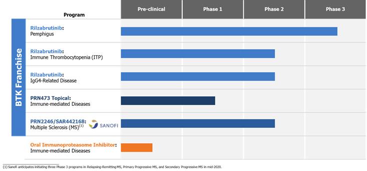 We are a late-stage biopharmaceutical company focused on developing novel therapies for immune-mediated diseases. Our proprietary Tailored Covalency® platform enables us to design and develop reversible covalent and irreversible covalent, small molecule inhibitors with potencies and selectivities that we believe will rival injectable biologics, but with the convenience of an oral or topical therapy. Our overall portfolio includes rilzabrutinib, PRN2246/SAR442168, PRN473 Topical, PRN1371 and our oral immunoproteasome inhibitor program. We retain full, worldwide rights to rilzabrutinib, PRN473 Topical, PRN1371 and our oral immunoproteasome inhibitor program, and have an ongoing collaboration with Sanofi for PRN2246/SAR442168. The company has prioritized the portfolio and our current clinical pipeline includes rilzabrutinib (formerly known as PRN1008), PRN473 Topical, and PRN2246/SAR442168. Our lead candidate, rilzabrutinib, a wholly owned Bruton Tyrosine Kinase (BTK) inhibitor, is in a Phase 3 trial for the treatment of pemphigus (pemphigus vulgaris (PV) and pemphigus foliaceus (PF)), and in a Phase 1/2 trial for the treatment of Immune Thrombocytopenia (ITP). In addition, we anticipate initiating a Phase 2 trial of rilzabrutinib for the treatment of IgG4-Related Disease (RD).