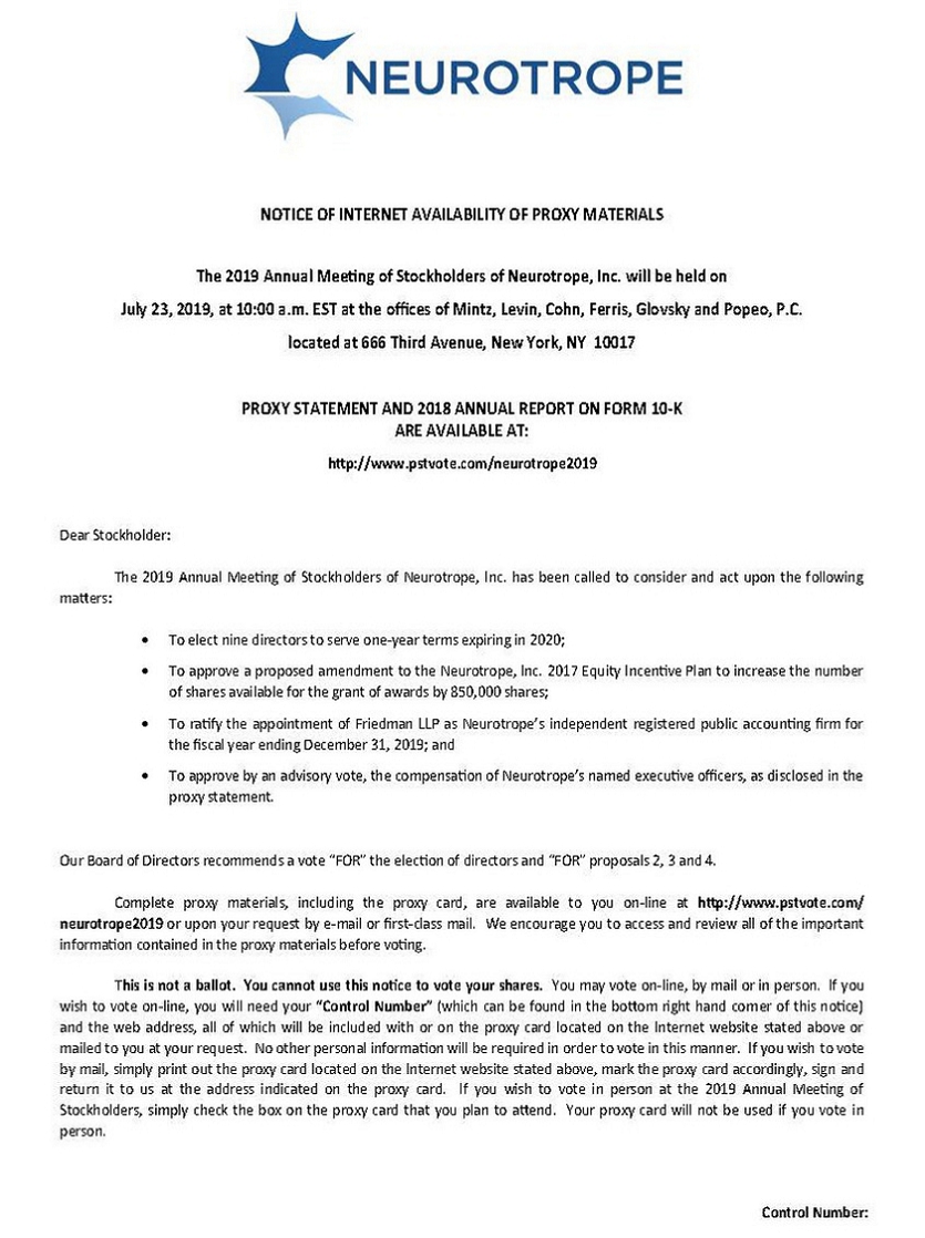 NOTICE OF INTERNET AVAILABILITY OF PROXY MATERIALS The 2019 Annual Meeting of Stockholders of Neurotrope, Inc. will be held on July 23, 2019, at 10:00 a.m. EST at the offices of Mintz, Levin, Cohn, Ferris, Glovsky and Popeo, P.C. located at 666 Third Avenue, New York, NY 10017 PROXY STATEMENT AND 2018 ANNUAL REPORT ON FORM 10-K ARE AVAILABLE AT: http://www.pstvote.com/neurotrope2019 Dear Stockholder: The 2019 Annual Meeting of Stockholders of Neurotrope, Inc. has been called to consider and act upon the following matters: • To elect nine directors to serve one-year terms expiring in 2020; • To approve a proposed amendment to the Neurotrope, Inc. 2017 Equity Incentive Plan to increase the number of shares available for the grant of awards by 850,000 shares; • To ratify the appointment of Friedman LLP as Neurotrope’s independent registered public accounting firm for the fiscal year ending December 31, 2019; and • To approve by an advisory vote, the compensation of Neurotrope’s named executive officers, as disclosed in the proxy statement. Our Board of Directors recommends a vote “FOR” the election of directors and “FOR” proposals 2, 3 and 4. Complete proxy materials, including the proxy card, are available to you on-line at http://www.pstvote.com/neurotrope2019 or upon your request by e-mail or first-class mail. We encourage you to access and review all of the important information contained in the proxy materials before voting. This is not a ballot. You cannot use this notice to vote your shares. You may vote on-line, by mail or in person. If you wish to vote on-line, you will need your “Control Number” (which can be found in the bottom right hand corner of this notice) and the web address, all of which will be included with or on the proxy card located on the Internet website stated above or mailed to you at your request. No other personal information will be required in order to vote in this manner. If you wish to vote by mail, simply print out the proxy card located on the Internet website stated above, mark the proxy card accordingly, sign and return it to us at the address indicated on the proxy card. If you wish to vote in person at the 2019 Annual Meeting of Stockholders, simply check the box on the proxy card that you plan to attend. Your proxy card will not be used if you vote in person. Control Number: