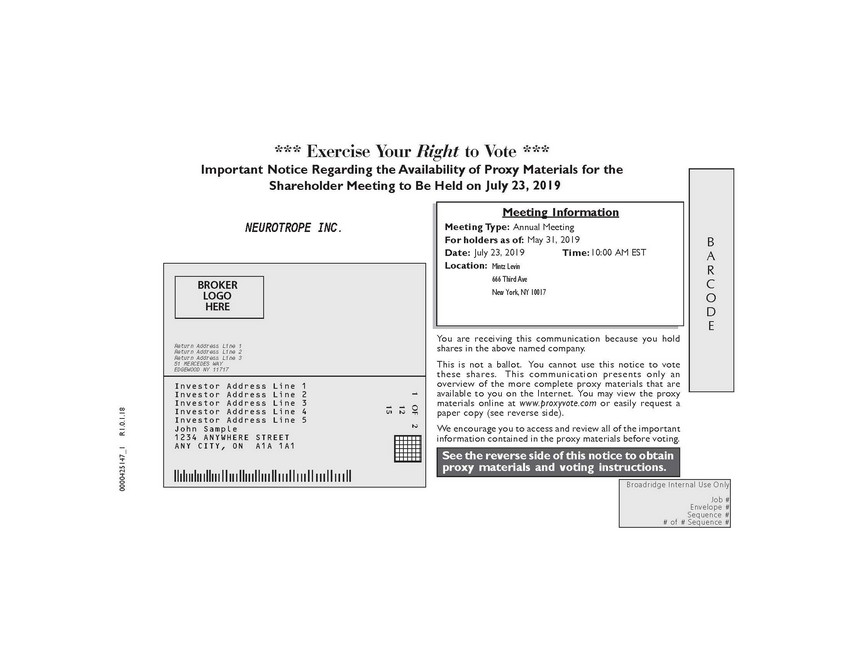 BARCODE See the reverse side of this notice to obtain proxy materials and voting instructions. BROKER LOGO HERE 1 OF 2 12 15 1234567 1234567 1234567 1234567 1234567 1234567 1234567 Broadridge Internal Use Only Job # Envelope # Sequence # # of # Sequence # *** Exercise Your Right to Vote *** Important Notice Regarding the Availability of Proxy Materials for the Shareholder Meeting to Be Held on <mtgdate>. You are receiving this communication because you hold shares in the above named company. This is not a ballot. You cannot use this notice to vote these shares. This communication presents only an overview of the more complete proxy materials that are available to you on the Internet. You may view the proxy materials online at www.proxyvote.com or easily request a paper copy (see reverse side). We encourage you to access and review all of the important information contained in the proxy materials before voting. Meeting Information Meeting Type: <mtgtype> For holders as of: <recdate> Date: Time: <mtgtime> Location: 0000425147_1 R1.0.1.18 NEUROTROPE INC. Annual Meeting July 23, 2019 July 23, 2019 10:00 AM EST May 31, 2019 Mintz Levin 666 Third Ave New York, NY 10017 Return Address Line 1 Return Address Line 2 Return Address Line 3 51 MERCEDES WAY EDGEWOOD NY 11717 Investor Address Line 1 Investor Address Line 2 Investor Address Line 3 Investor Address Line 4 Investor Address Line 5 John Sample 1234 ANYWHERE STREET ANY CITY, ON A1A 1A1