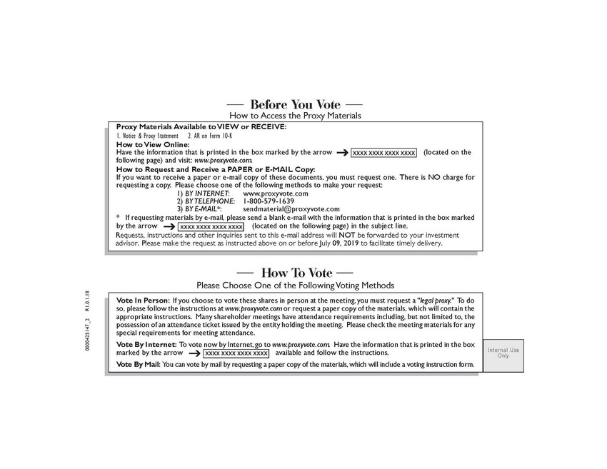How To Vote Please Choose One of the Following Voting Methods Before You Vote How to Access the Proxy Materials Proxy Materials Available to VIEW or RECEIVE: How to View Online: Have the information that is printed in the box marked by the arrow (located on the following page) and visit: www.proxyvote.com. How to Request and Receive a PAPER or E-MAIL Copy: If you want to receive a paper or e-mail copy of these documents, you must request one. There is NO charge for requesting a copy. Please choose one of the following methods to make your request: 1) BY INTERNET: www.proxyvote.com 2) BY TELEPHONE: 1-800-579-1639 3) BY E-MAIL*: sendmaterial@proxyvote.com * If requesting materials by e-mail, please send a blank e-mail with the information that is printed in the box marked by the arrow (located on the following page) in the subject line. .......... .......... Vote In Person: If you choose to vote these shares in person at the meeting, you must request a "legal proxy." To do so, please follow the instructions at www.proxyvote.com or request a paper copy of the materials, which will contain the appropriate instructions. Many shareholder meetings have attendance requirements including, but not limited to, the possession of an attendance ticket issued by the entity holding the meeting. Please check the meeting materials for any special requirements for meeting attendance. Vote By Internet: To vote now by Internet, go to www.proxyvote.com. Have the information that is printed in the box marked by the arrow available and follow the instructions. Vote By Mail: You can vote by mail by requesting a paper copy of the materials, which will include a voting instruction form. .......... 0000425147_2 R1.0.1.18 1. Notice & Proxy Statement 2. AR on Form 10-K Requests, instructions and other inquiries sent to this e-mail address will NOT be forwarded to your investment advisor. Please make the request as instructed above on or before July 09, 2019 to facilitate timely delivery.Internal Use Only