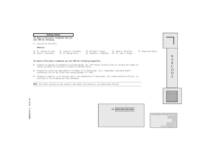 BARCODE Broadridge Internal Use Only xxxxxxxxxx xxxxxxxxxx Cusip Job # Envelope # Sequence # # of # Sequence # Voting items 0000425147_3 R1.0.1.18 The Board of Directors recommends that you vote FOR the following: 1. Election of Directors Nominees 01 Dr. Charles S. Ryan 02 Joshua N. Silverman 03 William S. Singer 04 James R. Gottlieb 05 Shana Kay Phares 06 Bruce T. Bernstein 07 Dr. George Perry 08 Jonathan L. Schechter 09 Dr. Ivan P. Gergel The Board of Directors recommends you vote FOR the following proposal(s): 2 Proposal to approve an amendment to the Neurotrope, Inc. 2017 Equity Incentive Plan to increase the number of shares available for the grant of awards by 850,000 shares. 3 Proposal to ratify the appointment of Friedman LLP as Neurotrope, Inc's independent registered public accounting firm for the fiscal year ending December 31, 2019. 4 Proposal to approve, on an advisory basis, the compensation of Neurotrope, Inc's named executive officers, as disclosed in the accompanying Proxy Statement. NOTE: Such other business as may properly come before the meeting or any adjournment thereof.