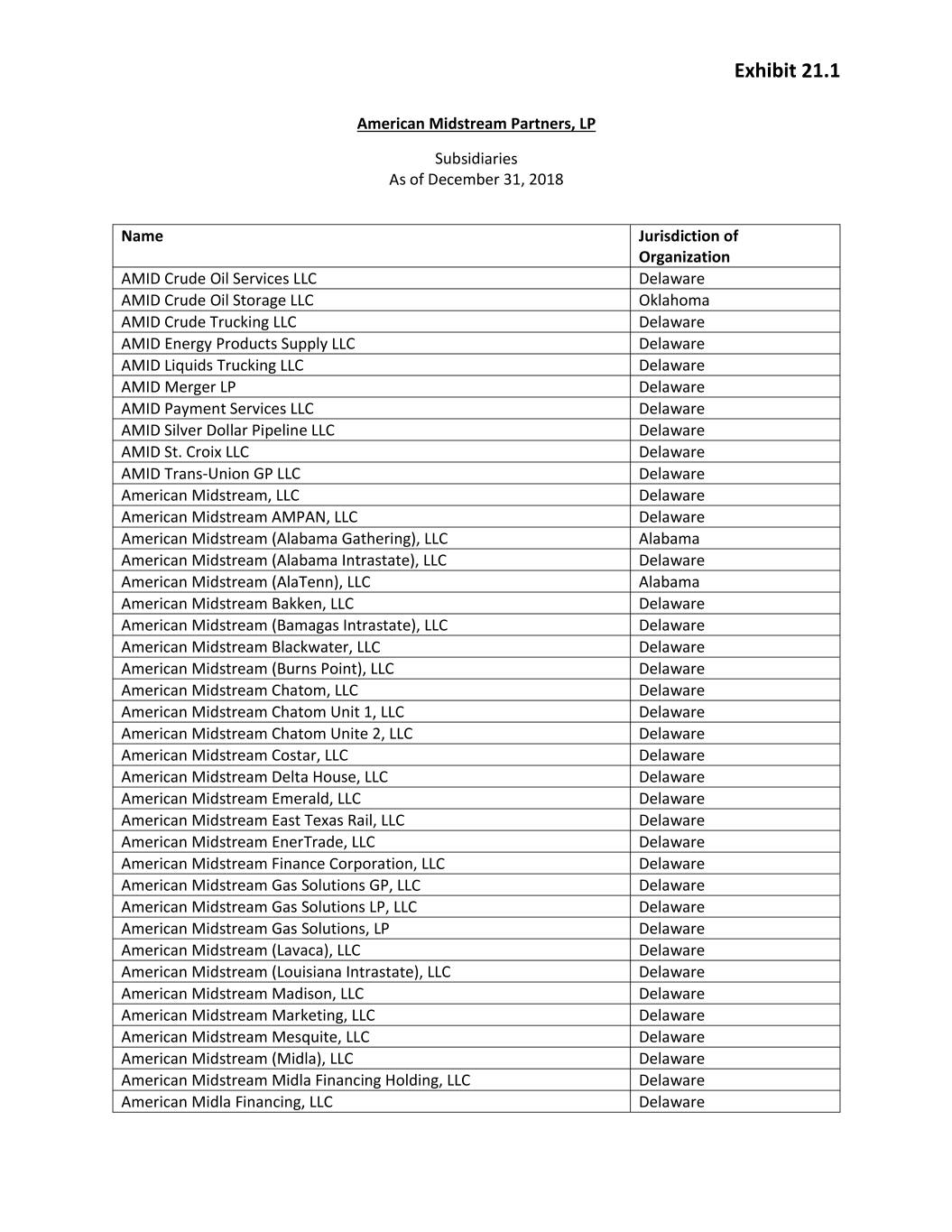 Exhibit 21.1 American Midstream Partners, LP Subsidiaries As of December 31, 2018 Name Jurisdiction of Organization AMID Crude Oil Services LLC Delaware AMID Crude Oil Storage LLC Oklahoma AMID Crude Trucking LLC Delaware AMID Energy Products Supply LLC Delaware AMID Liquids Trucking LLC Delaware AMID Merger LP Delaware AMID Payment Services LLC Delaware AMID Silver Dollar Pipeline LLC Delaware AMID St. Croix LLC Delaware AMID Trans‐Union GP LLC Delaware American Midstream, LLC Delaware American Midstream AMPAN, LLC Delaware American Midstream (Alabama Gathering), LLC Alabama American Midstream (Alabama Intrastate), LLC Delaware American Midstream (AlaTenn), LLC Alabama American Midstream Bakken, LLC Delaware American Midstream (Bamagas Intrastate), LLC Delaware American Midstream Blackwater, LLC Delaware American Midstream (Burns Point), LLC Delaware American Midstream Chatom, LLC Delaware American Midstream Chatom Unit 1, LLC Delaware American Midstream Chatom Unite 2, LLC Delaware American Midstream Costar, LLC Delaware American Midstream Delta House, LLC Delaware American Midstream Emerald, LLC Delaware American Midstream East Texas Rail, LLC Delaware American Midstream EnerTrade, LLC Delaware American Midstream Finance Corporation, LLC Delaware American Midstream Gas Solutions GP, LLC Delaware American Midstream Gas Solutions LP, LLC Delaware American Midstream Gas Solutions, LP Delaware American Midstream (Lavaca), LLC Delaware American Midstream (Louisiana Intrastate), LLC Delaware American Midstream Madison, LLC Delaware American Midstream Marketing, LLC Delaware American Midstream Mesquite, LLC Delaware American Midstream (Midla), LLC Delaware American Midstream Midla Financing Holding, LLC Delaware American Midla Financing, LLC Delaware