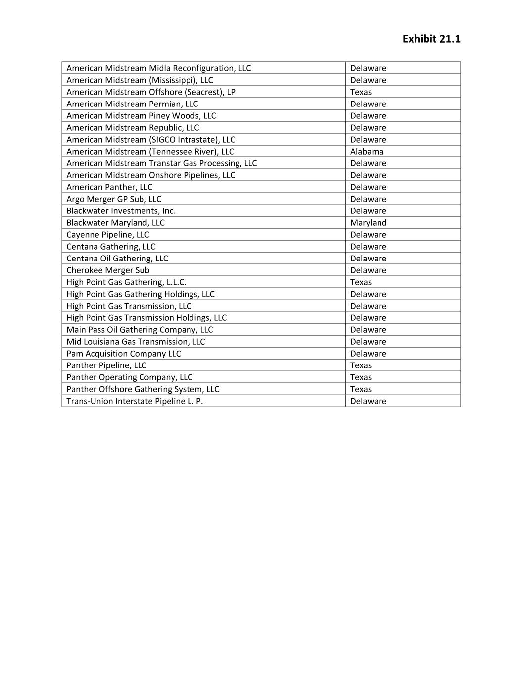 Exhibit 21.1 American Midstream Midla Reconfiguration, LLC Delaware American Midstream (Mississippi), LLC Delaware American Midstream Offshore (Seacrest), LP Texas American Midstream Permian, LLC Delaware American Midstream Piney Woods, LLC Delaware American Midstream Republic, LLC Delaware American Midstream (SIGCO Intrastate), LLC Delaware American Midstream (Tennessee River), LLC Alabama American Midstream Transtar Gas Processing, LLC Delaware American Midstream Onshore Pipelines, LLC Delaware American Panther, LLC Delaware Argo Merger GP Sub, LLC Delaware Blackwater Investments, Inc. Delaware Blackwater Maryland, LLC Maryland Cayenne Pipeline, LLC Delaware Centana Gathering, LLC Delaware Centana Oil Gathering, LLC Delaware Cherokee Merger Sub Delaware High Point Gas Gathering, L.L.C. Texas High Point Gas Gathering Holdings, LLC Delaware High Point Gas Transmission, LLC Delaware High Point Gas Transmission Holdings, LLC Delaware Main Pass Oil Gathering Company, LLC Delaware Mid Louisiana Gas Transmission, LLC Delaware Pam Acquisition Company LLC Delaware Panther Pipeline, LLC Texas Panther Operating Company, LLC Texas Panther Offshore Gathering System, LLC Texas Trans‐Union Interstate Pipeline L. P. Delaware