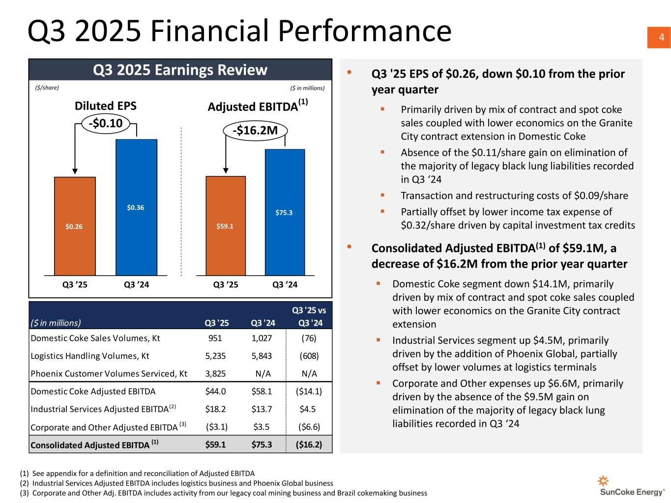 2 2Forward-Looking Statements This presentation should be reviewed in conjunction with the third quarter 2025 earnings release of SunCoke Energy, Inc. (SunCoke) and conference call held on November 4, 2025 at 11:00 a.m. ET. This presentation contains “forward-looking statements” (as defined in Section 27A of the Securities Act of 1933, as amended and Section 21E of the Securities Exchange Act of 1934, as amended). Forward-looking statements often may be identified by the use of such words as "believe," "expect," "plan," "project," "intend," "anticipate," "estimate," "predict," "potential," "continue," "may," "will," "should," or the negative of these terms, or similar expressions. However, the absence of these words or similar expressions does not mean that a statement is not forward-looking. Any statements made in this presentation or during the related conference call that are not statements of historical fact, including statements about our full-year consolidated and segment 2025 guidance, our 2025 key initiatives, future dividends and the timing of such dividend payments, anticipated transaction benefits and synergies of the Phoenix Global acquisition and expected timing of Phoenix Global's integration, the intended hosting and timing of any investor conferences, the effect of restrictive trade regulations, including tariffs, on us or our major customers, business partners and/or suppliers, and expected future financial performance are forward-looking statements and should be evaluated as such. Forward-looking statements represent only our present beliefs regarding future events, many of which are inherently uncertain and involve significant known and unknown risks and uncertainties (many of which are beyond the control of SunCoke) that could cause our actual results and financial condition to differ materially from the anticipated results and financial condition indicated in such forward-looking statements. These risks and uncertainties include, but are not limited to, the risks and uncertainties described in Item 1A (“Risk Factors”) of our Annual Report on Form 10- K for the most recently completed fiscal year, as well as those described from time to time in our other reports and filings with the Securities and Exchange Commission (SEC). In accordance with the safe harbor provisions of the Private Securities Litigation Reform Act of 1995, SunCoke has included in its filings with the SEC cautionary language identifying important factors (but not necessarily all the important factors) that could cause actual results to differ materially from those expressed in any forward-looking statement made by SunCoke. For information concerning these factors and other important information regarding the matters discussed in this presentation, see SunCoke’s SEC filings, copies of which are available free of charge on SunCoke's website at www.suncoke.com or on the SEC’s website at www.sec.gov. All forward-looking statements included in this presentation or made during the related conference call are expressly qualified in their entirety by such cautionary statements. Unpredictable or unknown factors not discussed in this presentation also could have material adverse effects on forward-looking statements. Forward-looking statements are not guarantees of future performance, but are based upon the current knowledge, beliefs and expectations of SunCoke management, and upon assumptions by SunCoke concerning future conditions, any or all of which ultimately may prove to be inaccurate. You should not place undue reliance on these forward-looking statements, which speak only as of the date of the earnings release. SunCoke does not intend, and expressly disclaims any obligation, to update or alter its forward-looking statements (or associated cautionary language), whether as a result of new information, future events, or otherwise, after the date of the earnings release except as required by applicable law.