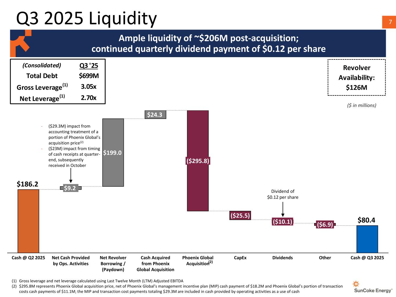 6Industrial Services Business Summary New Industrial Services segment includes former Logistics segment and Phoenix Global • New Industrial Services segment will report total volumes handled for logistics and customer volumes serviced for Phoenix Global ▪ Q3 total logistics handling volumes of 5,235Kt ▪ Q3 customer volumes serviced for Phoenix of 3,825Kt (2 months of results included) • Delivered Adjusted EBITDA of $18.2M in Q3 ‘25 vs $13.7M in Q3 ‘24 ▪ Addition of two months of Phoenix Global results ▪ Lower volumes at logistics terminals driven by market conditions • FY 2025 Industrial Services Adjusted EBITDA guidance range of $63M - $67M ▪ Addition of five months of Phoenix Global results ▪ Expected improvement in 2H logistics volumes impacted by persistent weak market conditions (1) See definition and reconciliation of Adjusted EBITDA elsewhere in the appendix Industrial Services Performance 5,843 5,262 5,724 4,746 5,235 3,825 $13.7M $11.5M $13.7M $7.7M $18.2M Q3 ’24 Q4 ’24 Q1 ’25 Q2 ’25 Q3 ’25 Logistics handling volumes, Kt Phoenix customer volumes serviced, Kt Adjusted EBITDA(1)