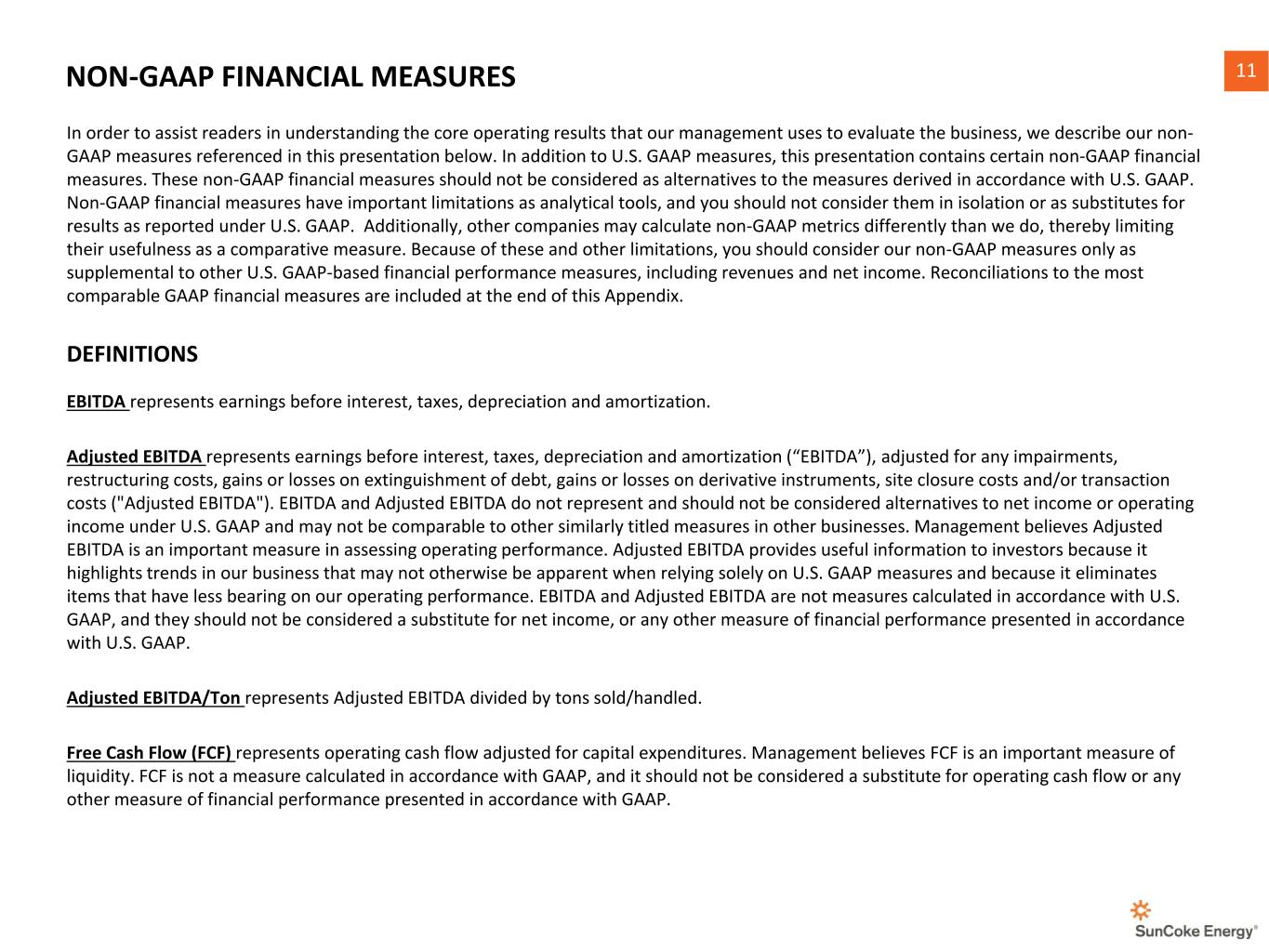 11 11 In order to assist readers in understanding the core operating results that our management uses to evaluate the business, we describe our non- GAAP measures referenced in this presentation below. In addition to U.S. GAAP measures, this presentation contains certain non-GAAP financial measures. These non-GAAP financial measures should not be considered as alternatives to the measures derived in accordance with U.S. GAAP. Non-GAAP financial measures have important limitations as analytical tools, and you should not consider them in isolation or as substitutes for results as reported under U.S. GAAP. Additionally, other companies may calculate non-GAAP metrics differently than we do, thereby limiting their usefulness as a comparative measure. Because of these and other limitations, you should consider our non-GAAP measures only as supplemental to other U.S. GAAP-based financial performance measures, including revenues and net income. Reconciliations to the most comparable GAAP financial measures are included at the end of this Appendix. DEFINITIONS EBITDA represents earnings before interest, taxes, depreciation and amortization. Adjusted EBITDA represents earnings before interest, taxes, depreciation and amortization (“EBITDA”), adjusted for any impairments, restructuring costs, gains or losses on extinguishment of debt, gains or losses on derivative instruments, site closure costs and/or transaction costs ("Adjusted EBITDA"). EBITDA and Adjusted EBITDA do not represent and should not be considered alternatives to net income or operating income under U.S. GAAP and may not be comparable to other similarly titled measures in other businesses. Management believes Adjusted EBITDA is an important measure in assessing operating performance. Adjusted EBITDA provides useful information to investors because it highlights trends in our business that may not otherwise be apparent when relying solely on U.S. GAAP measures and because it eliminates items that have less bearing on our operating performance. EBITDA and Adjusted EBITDA are not measures calculated in accordance with U.S. GAAP, and they should not be considered a substitute for net income, or any other measure of financial performance presented in accordance with U.S. GAAP. Adjusted EBITDA/Ton represents Adjusted EBITDA divided by tons sold/handled. Free Cash Flow (FCF) represents operating cash flow adjusted for capital expenditures. Management believes FCF is an important measure of liquidity. FCF is not a measure calculated in accordance with GAAP, and it should not be considered a substitute for operating cash flow or any other measure of financial performance presented in accordance with GAAP. NON-GAAP FINANCIAL MEASURES