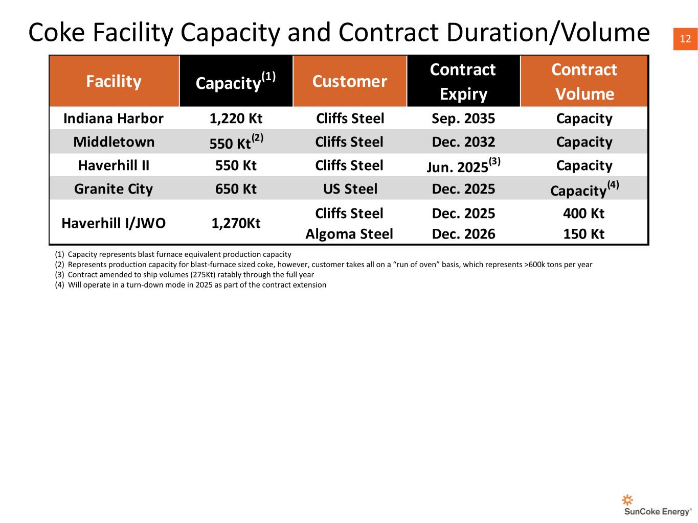 12 12Coke Facility Capacity and Contract Duration/Volume (1) Capacity represents blast furnace equivalent production capacity (2) Represents production capacity for blast-furnace sized coke, however, customer takes all on a “run of oven” basis, which represents >600k tons per year (3) Contract amended to ship volumes (275Kt) ratably through the full year (4) Will operate in a turn-down mode in 2025 as part of the contract extension Facility Capacity(1) Customer Contract Expiry Contract Volume Indiana Harbor 1,220 Kt Cliffs Steel Sep. 2035 Capacity Middletown 550 Kt(2) Cliffs Steel Dec. 2032 Capacity Haverhill II 550 Kt Cliffs Steel Jun. 2025(3) Capacity Granite City 650 Kt US Steel Dec. 2025 Capacity (4) Haverhill I/JWO 1,270Kt Cliffs Steel Algoma Steel Dec. 2025 Dec. 2026 400 Kt 150 Kt