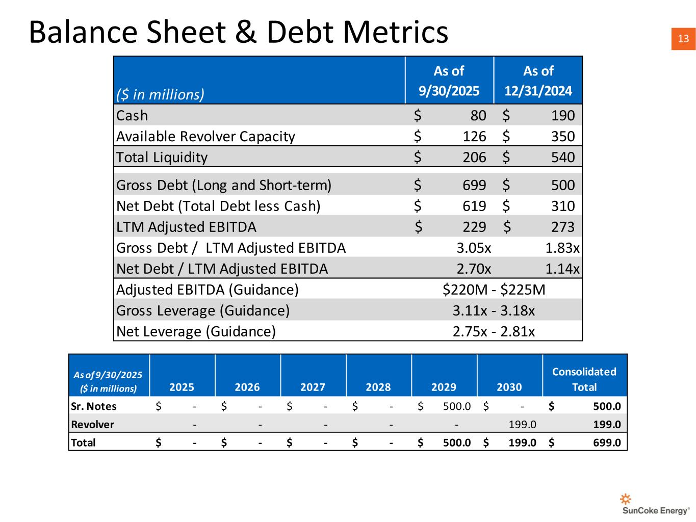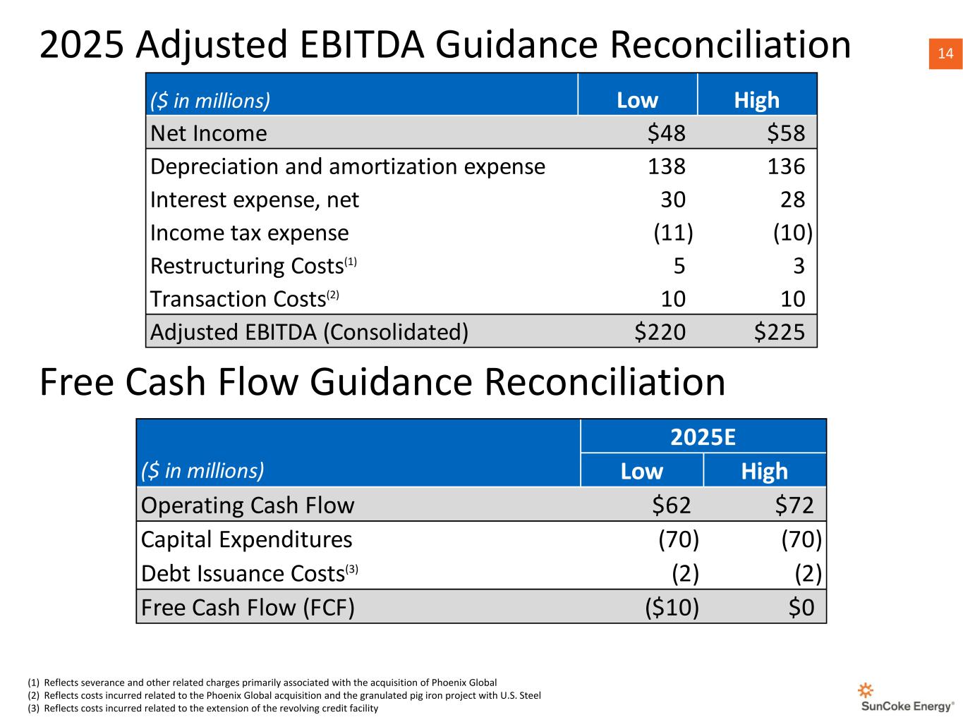 82025 Updated Guidance Summary Expect 2025 Consolidated Adjusted EBITDA(1) of $220M - $225M; 2025 Free Cash Flow(2) impacted by deferral of cash receipts (1) See definition and reconciliation of Adjusted EBITDA elsewhere in the appendix (2) See definition and reconciliation of Free Cash Flow (FCF) elsewhere in the appendix (3) Domestic Coke Adjusted EBITDA/ton calculated as Domestic Coke EBITDA/Domestic Coke Sales (4) Reflects severance and other related charges primarily associated with the acquisition of Phoenix Global (5) Reflects costs incurred related to the Phoenix Global acquisition, the granulated pig iron project with U.S. Steel, and the extension of the revolving credit facility (6) Estimate as of the date of this presentation; assumes no additional cash receipts from this customer in 2025; actively pursuing enforcement of contract (7) Phoenix Global’s management incentive plan and transaction costs cash payments totaling $29.3M are included in cash provided by operating activities as a use of cash * The Company's 2025 guidance is based on the Company's current estimates and assumptions that are subject to change and may be outside the control of the Company. If actual results vary from these estimates and assumptions, the Company's expectations may change. There can be no assurances that SunCoke will achieve the results expressed by this guidance. ($ in millions) Low End High End Low End High End Adjusted EBITDA(1) $210 $225 $220 $225 Cash interest, net ($23) ($21) ($26) ($24) Cash taxes ($17) ($21) ($4) ($7) Total capex ($65) ($65) ($70) ($70) Restructuring Costs(4) $0 $0 ($5) ($3) Transaction and Debt Issuance Costs(5) $0 $0 ($12) ($12) Deferral of cash receipt from customer breach of contract(6) $0 $0 ($70) ($70) Cash impact from accounting treatment of a portion of Phoenix Global's acquisition price(7) $0 $0 ($29) ($29) Non-cash items and working capital changes ($5) ($3) ($14) ($10) Free Cash Flow (FCF)(2) $100 $115 ($10) $0 Adjusted EBITDA to FCF Walk 2025E Revised2025E Original 2025 Original 2025 Revised Guidance Guidance* Adjusted EBITDA Consolidated(1) $210M - $225M $220M - $225M Domestic Coke EBITDA $185M - $192M $172M - $176M Industrial Services EBITDA $45M - $50M $63M - $67M Domestic Coke Sales ~4.0M tons ~3.7M tons Domestic Coke Production ~4.0M tons ~3.9M tons Domestic Coke Adjusted EBITDA/ton (3) $46 - $48/ton $46 - $48/ton Total Capital Expenditures ~$65M ~$70M Operating Cash Flow $165M - $180M $62M - $72M Cash Taxes $17M - $21M $4M - $7M Metric