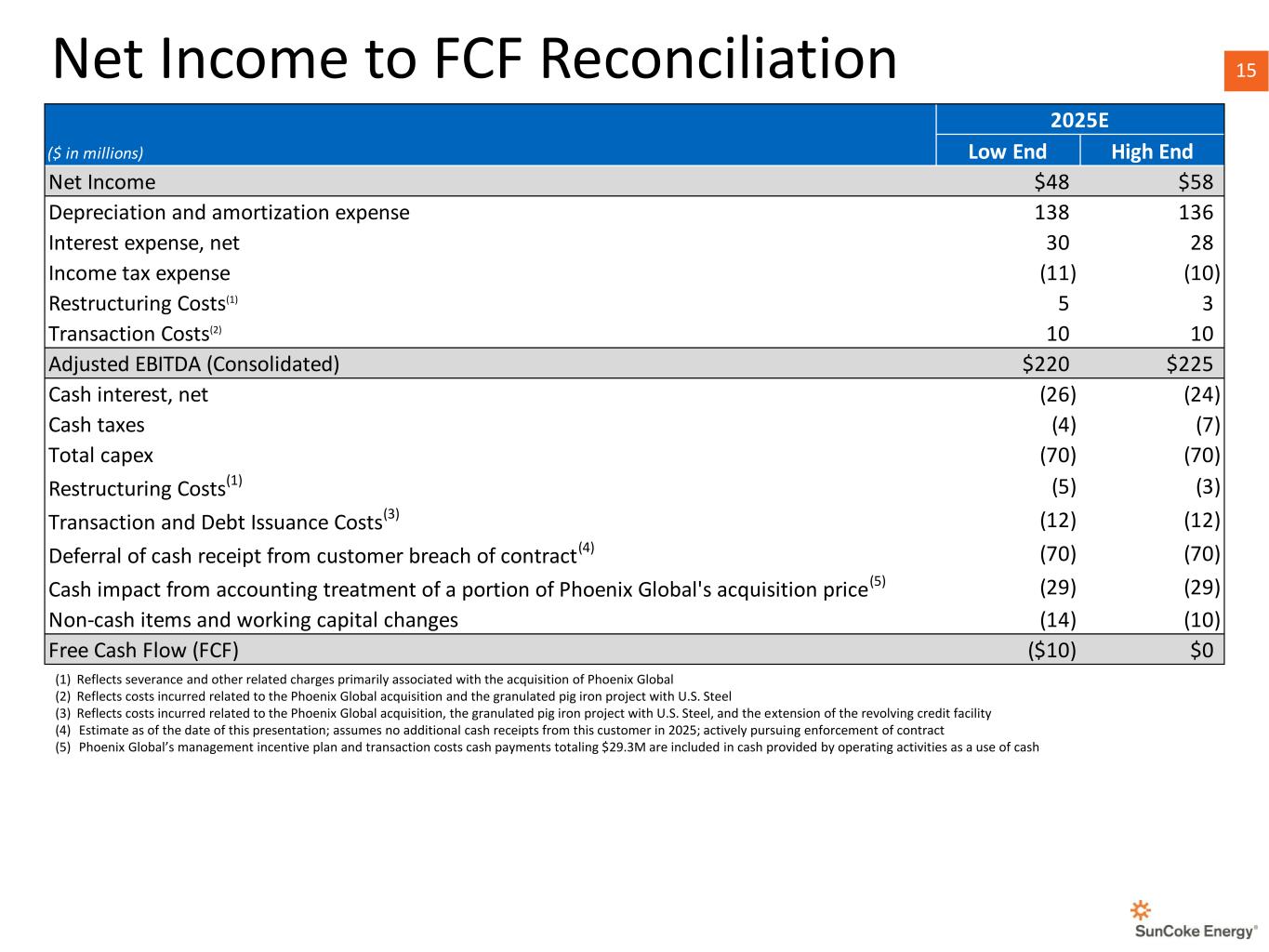 14 142025 Adjusted EBITDA Guidance Reconciliation Free Cash Flow Guidance Reconciliation (1) Reflects severance and other related charges primarily associated with the acquisition of Phoenix Global (2) Reflects costs incurred related to the Phoenix Global acquisition and the granulated pig iron project with U.S. Steel (3) Reflects costs incurred related to the extension of the revolving credit facility Low High Net Income $48 $58 Depreciation and amortization expense 138 136 Interest expense, net 30 28 Income tax expense (11) (10) Restructuring Costs(1) 5 3 Transaction Costs(2) 10 10 Adjusted EBITDA (Consolidated) $220 $225 ($ in millions) ($ in millions) Low High Operating Cash Flow $62 $72 Capital Expenditures (70) (70) Debt Issuance Costs(3) (2) (2) Free Cash Flow (FCF) ($10) $0 2025E