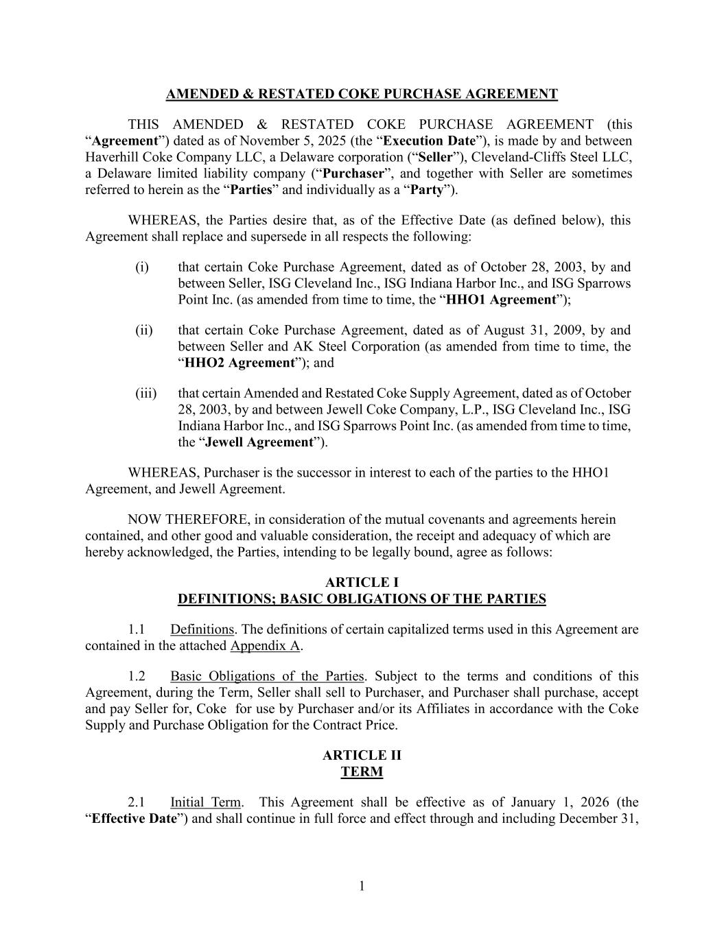 1 AMENDED & RESTATED COKE PURCHASE AGREEMENT THIS AMENDED & RESTATED COKE PURCHASE AGREEMENT (this “Agreement”) dated as of November 5, 2025 (the “Execution Date”), is made by and between Haverhill Coke Company LLC, a Delaware corporation (“Seller”), Cleveland-Cliffs Steel LLC, a Delaware limited liability company (“Purchaser”, and together with Seller are sometimes referred to herein as the “Parties” and individually as a “Party”). WHEREAS, the Parties desire that, as of the Effective Date (as defined below), this Agreement shall replace and supersede in all respects the following: (i) that certain Coke Purchase Agreement, dated as of October 28, 2003, by and between Seller, ISG Cleveland Inc., ISG Indiana Harbor Inc., and ISG Sparrows Point Inc. (as amended from time to time, the “HHO1 Agreement”); (ii) that certain Coke Purchase Agreement, dated as of August 31, 2009, by and between Seller and AK Steel Corporation (as amended from time to time, the “HHO2 Agreement”); and (iii) that certain Amended and Restated Coke Supply Agreement, dated as of October 28, 2003, by and between Jewell Coke Company, L.P., ISG Cleveland Inc., ISG Indiana Harbor Inc., and ISG Sparrows Point Inc. (as amended from time to time, the “Jewell Agreement”). WHEREAS, Purchaser is the successor in interest to each of the parties to the HHO1 Agreement, and Jewell Agreement. NOW THEREFORE, in consideration of the mutual covenants and agreements herein contained, and other good and valuable consideration, the receipt and adequacy of which are hereby acknowledged, the Parties, intending to be legally bound, agree as follows: ARTICLE I DEFINITIONS; BASIC OBLIGATIONS OF THE PARTIES 1.1 Definitions. The definitions of certain capitalized terms used in this Agreement are contained in the attached Appendix A. 1.2 Basic Obligations of the Parties. Subject to the terms and conditions of this Agreement, during the Term, Seller shall sell to Purchaser, and Purchaser shall purchase, accept and pay Seller for, Coke for use by Purchaser and/or its Affiliates in accordance with the Coke Supply and Purchase Obligation for the Contract Price. ARTICLE II TERM 2.1 Initial Term. This Agreement shall be effective as of January 1, 2026 (the “Effective Date”) and shall continue in full force and effect through and including December 31,