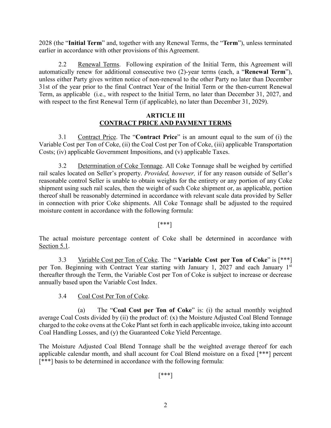 2 2028 (the “Initial Term” and, together with any Renewal Terms, the “Term”), unless terminated earlier in accordance with other provisions of this Agreement. 2.2 Renewal Terms. Following expiration of the Initial Term, this Agreement will automatically renew for additional consecutive two (2)-year terms (each, a “Renewal Term”), unless either Party gives written notice of non-renewal to the other Party no later than December 31st of the year prior to the final Contract Year of the Initial Term or the then-current Renewal Term, as applicable (i.e., with respect to the Initial Term, no later than December 31, 2027, and with respect to the first Renewal Term (if applicable), no later than December 31, 2029). ARTICLE III CONTRACT PRICE AND PAYMENT TERMS 3.1 Contract Price. The “Contract Price” is an amount equal to the sum of (i) the Variable Cost per Ton of Coke, (ii) the Coal Cost per Ton of Coke, (iii) applicable Transportation Costs; (iv) applicable Government Impositions, and (v) applicable Taxes. 3.2 Determination of Coke Tonnage. All Coke Tonnage shall be weighed by certified rail scales located on Seller’s property. Provided, however, if for any reason outside of Seller’s reasonable control Seller is unable to obtain weights for the entirety or any portion of any Coke shipment using such rail scales, then the weight of such Coke shipment or, as applicable, portion thereof shall be reasonably determined in accordance with relevant scale data provided by Seller in connection with prior Coke shipments. All Coke Tonnage shall be adjusted to the required moisture content in accordance with the following formula: [***] The actual moisture percentage content of Coke shall be determined in accordance with Section 5.1. 3.3 Variable Cost per Ton of Coke. The “ Variable Cost per Ton of Coke” is [***] per Ton. Beginning with Contract Year starting with January 1, 2027 and each January 1st thereafter through the Term, the Variable Cost per Ton of Coke is subject to increase or decrease annually based upon the Variable Cost Index. 3.4 Coal Cost Per Ton of Coke. (a) The “Coal Cost per Ton of Coke” is: (i) the actual monthly weighted average Coal Costs divided by (ii) the product of: (x) the Moisture Adjusted Coal Blend Tonnage charged to the coke ovens at the Coke Plant set forth in each applicable invoice, taking into account Coal Handling Losses, and (y) the Guaranteed Coke Yield Percentage. The Moisture Adjusted Coal Blend Tonnage shall be the weighted average thereof for each applicable calendar month, and shall account for Coal Blend moisture on a fixed [***] percent [***] basis to be determined in accordance with the following formula: [***]
