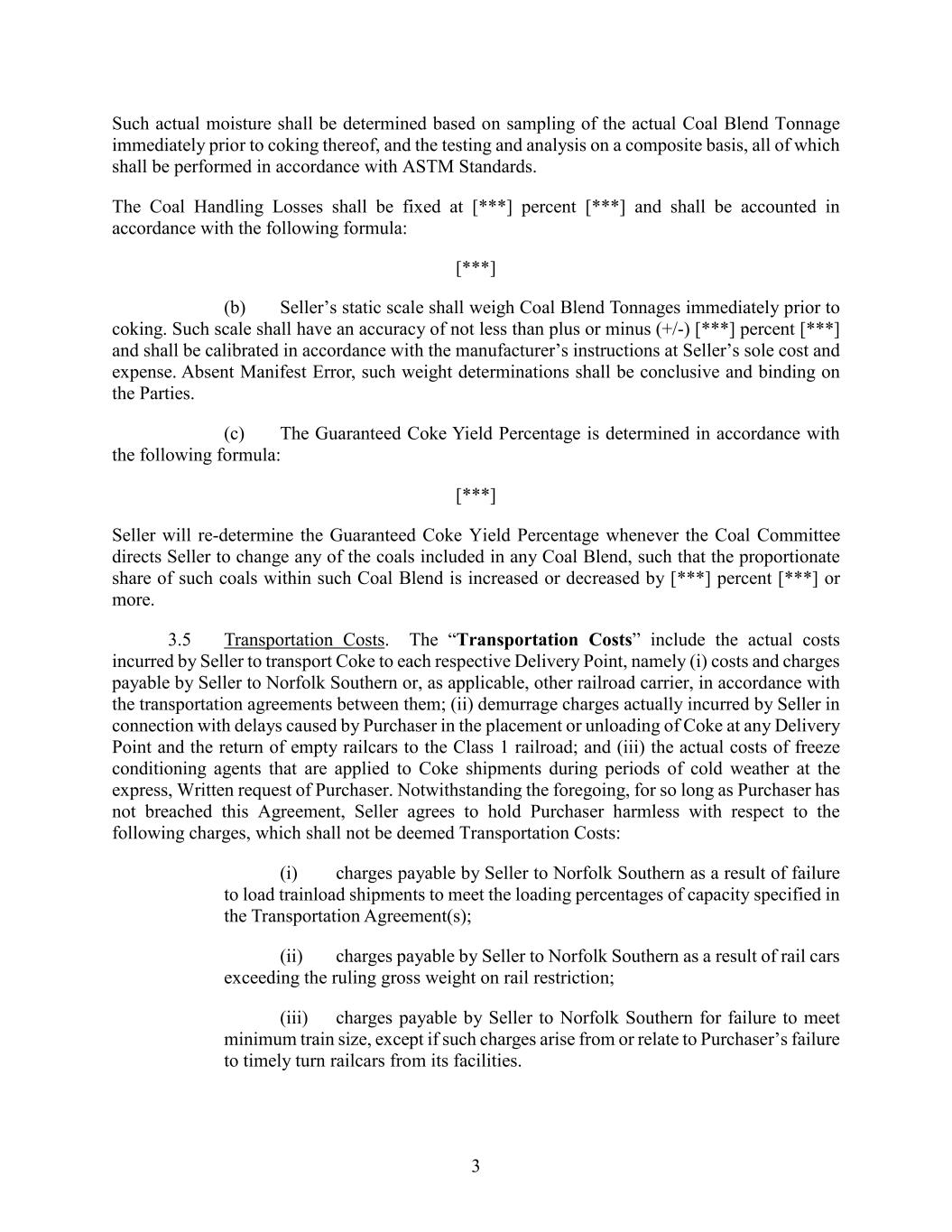 3 Such actual moisture shall be determined based on sampling of the actual Coal Blend Tonnage immediately prior to coking thereof, and the testing and analysis on a composite basis, all of which shall be performed in accordance with ASTM Standards. The Coal Handling Losses shall be fixed at [***] percent [***] and shall be accounted in accordance with the following formula: [***] (b) Seller’s static scale shall weigh Coal Blend Tonnages immediately prior to coking. Such scale shall have an accuracy of not less than plus or minus (+/-) [***] percent [***] and shall be calibrated in accordance with the manufacturer’s instructions at Seller’s sole cost and expense. Absent Manifest Error, such weight determinations shall be conclusive and binding on the Parties. (c) The Guaranteed Coke Yield Percentage is determined in accordance with the following formula: [***] Seller will re-determine the Guaranteed Coke Yield Percentage whenever the Coal Committee directs Seller to change any of the coals included in any Coal Blend, such that the proportionate share of such coals within such Coal Blend is increased or decreased by [***] percent [***] or more. 3.5 Transportation Costs. The “Transportation Costs” include the actual costs incurred by Seller to transport Coke to each respective Delivery Point, namely (i) costs and charges payable by Seller to Norfolk Southern or, as applicable, other railroad carrier, in accordance with the transportation agreements between them; (ii) demurrage charges actually incurred by Seller in connection with delays caused by Purchaser in the placement or unloading of Coke at any Delivery Point and the return of empty railcars to the Class 1 railroad; and (iii) the actual costs of freeze conditioning agents that are applied to Coke shipments during periods of cold weather at the express, Written request of Purchaser. Notwithstanding the foregoing, for so long as Purchaser has not breached this Agreement, Seller agrees to hold Purchaser harmless with respect to the following charges, which shall not be deemed Transportation Costs: (i) charges payable by Seller to Norfolk Southern as a result of failure to load trainload shipments to meet the loading percentages of capacity specified in the Transportation Agreement(s); (ii) charges payable by Seller to Norfolk Southern as a result of rail cars exceeding the ruling gross weight on rail restriction; (iii) charges payable by Seller to Norfolk Southern for failure to meet minimum train size, except if such charges arise from or relate to Purchaser’s failure to timely turn railcars from its facilities.