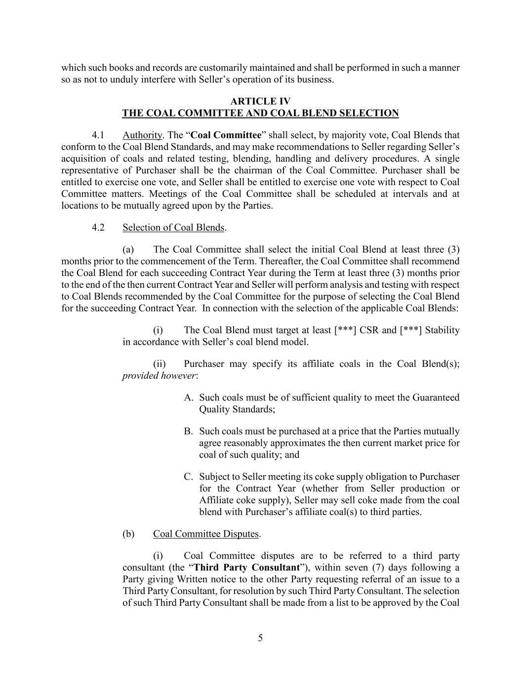 5 which such books and records are customarily maintained and shall be performed in such a manner so as not to unduly interfere with Seller’s operation of its business. ARTICLE IV THE COAL COMMITTEE AND COAL BLEND SELECTION 4.1 Authority. The “Coal Committee” shall select, by majority vote, Coal Blends that conform to the Coal Blend Standards, and may make recommendations to Seller regarding Seller’s acquisition of coals and related testing, blending, handling and delivery procedures. A single representative of Purchaser shall be the chairman of the Coal Committee. Purchaser shall be entitled to exercise one vote, and Seller shall be entitled to exercise one vote with respect to Coal Committee matters. Meetings of the Coal Committee shall be scheduled at intervals and at locations to be mutually agreed upon by the Parties. 4.2 Selection of Coal Blends. (a) The Coal Committee shall select the initial Coal Blend at least three (3) months prior to the commencement of the Term. Thereafter, the Coal Committee shall recommend the Coal Blend for each succeeding Contract Year during the Term at least three (3) months prior to the end of the then current Contract Year and Seller will perform analysis and testing with respect to Coal Blends recommended by the Coal Committee for the purpose of selecting the Coal Blend for the succeeding Contract Year. In connection with the selection of the applicable Coal Blends: (i) The Coal Blend must target at least [***] CSR and [***] Stability in accordance with Seller’s coal blend model. (ii) Purchaser may specify its affiliate coals in the Coal Blend(s); provided however: A. Such coals must be of sufficient quality to meet the Guaranteed Quality Standards; B. Such coals must be purchased at a price that the Parties mutually agree reasonably approximates the then current market price for coal of such quality; and C. Subject to Seller meeting its coke supply obligation to Purchaser for the Contract Year (whether from Seller production or Affiliate coke supply), Seller may sell coke made from the coal blend with Purchaser’s affiliate coal(s) to third parties. (b) Coal Committee Disputes. (i) Coal Committee disputes are to be referred to a third party consultant (the “Third Party Consultant”), within seven (7) days following a Party giving Written notice to the other Party requesting referral of an issue to a Third Party Consultant, for resolution by such Third Party Consultant. The selection of such Third Party Consultant shall be made from a list to be approved by the Coal