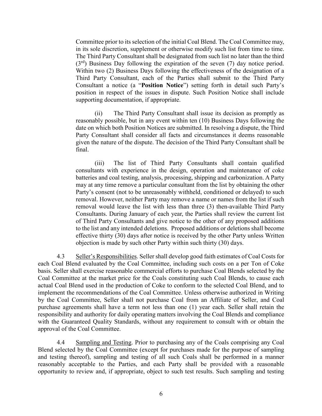 6 Committee prior to its selection of the initial Coal Blend. The Coal Committee may, in its sole discretion, supplement or otherwise modify such list from time to time. The Third Party Consultant shall be designated from such list no later than the third (3rd) Business Day following the expiration of the seven (7) day notice period. Within two (2) Business Days following the effectiveness of the designation of a Third Party Consultant, each of the Parties shall submit to the Third Party Consultant a notice (a “Position Notice”) setting forth in detail such Party’s position in respect of the issues in dispute. Such Position Notice shall include supporting documentation, if appropriate. (ii) The Third Party Consultant shall issue its decision as promptly as reasonably possible, but in any event within ten (10) Business Days following the date on which both Position Notices are submitted. In resolving a dispute, the Third Party Consultant shall consider all facts and circumstances it deems reasonable given the nature of the dispute. The decision of the Third Party Consultant shall be final. (iii) The list of Third Party Consultants shall contain qualified consultants with experience in the design, operation and maintenance of coke batteries and coal testing, analysis, processing, shipping and carbonization. A Party may at any time remove a particular consultant from the list by obtaining the other Party’s consent (not to be unreasonably withheld, conditioned or delayed) to such removal. However, neither Party may remove a name or names from the list if such removal would leave the list with less than three (3) then-available Third Party Consultants. During January of each year, the Parties shall review the current list of Third Party Consultants and give notice to the other of any proposed additions to the list and any intended deletions. Proposed additions or deletions shall become effective thirty (30) days after notice is received by the other Party unless Written objection is made by such other Party within such thirty (30) days. 4.3 Seller’s Responsibilities. Seller shall develop good faith estimates of Coal Costs for each Coal Blend evaluated by the Coal Committee, including such costs on a per Ton of Coke basis. Seller shall exercise reasonable commercial efforts to purchase Coal Blends selected by the Coal Committee at the market price for the Coals constituting such Coal Blends, to cause each actual Coal Blend used in the production of Coke to conform to the selected Coal Blend, and to implement the recommendations of the Coal Committee. Unless otherwise authorized in Writing by the Coal Committee, Seller shall not purchase Coal from an Affiliate of Seller, and Coal purchase agreements shall have a term not less than one (1) year each. Seller shall retain the responsibility and authority for daily operating matters involving the Coal Blends and compliance with the Guaranteed Quality Standards, without any requirement to consult with or obtain the approval of the Coal Committee. 4.4 Sampling and Testing. Prior to purchasing any of the Coals comprising any Coal Blend selected by the Coal Committee (except for purchases made for the purpose of sampling and testing thereof), sampling and testing of all such Coals shall be performed in a manner reasonably acceptable to the Parties, and each Party shall be provided with a reasonable opportunity to review and, if appropriate, object to such test results. Such sampling and testing
