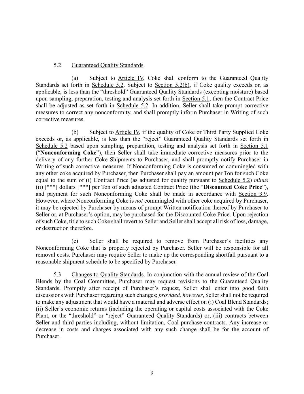 9 5.2 Guaranteed Quality Standards. (a) Subject to Article IV, Coke shall conform to the Guaranteed Quality Standards set forth in Schedule 5.2. Subject to Section 5.2(b), if Coke quality exceeds or, as applicable, is less than the “threshold” Guaranteed Quality Standards (excepting moisture) based upon sampling, preparation, testing and analysis set forth in Section 5.1, then the Contract Price shall be adjusted as set forth in Schedule 5.2. In addition, Seller shall take prompt corrective measures to correct any nonconformity, and shall promptly inform Purchaser in Writing of such corrective measures. (b) Subject to Article IV, if the quality of Coke or Third Party Supplied Coke exceeds or, as applicable, is less than the “reject” Guaranteed Quality Standards set forth in Schedule 5.2 based upon sampling, preparation, testing and analysis set forth in Section 5.1 (“Nonconforming Coke”), then Seller shall take immediate corrective measures prior to the delivery of any further Coke Shipments to Purchaser, and shall promptly notify Purchaser in Writing of such corrective measures. If Nonconforming Coke is consumed or commingled with any other coke acquired by Purchaser, then Purchaser shall pay an amount per Ton for such Coke equal to the sum of (i) Contract Price (as adjusted for quality pursuant to Schedule 5.2) minus (ii) [***] dollars [***] per Ton of such adjusted Contract Price (the “Discounted Coke Price”), and payment for such Nonconforming Coke shall be made in accordance with Section 3.9. However, where Nonconforming Coke is not commingled with other coke acquired by Purchaser, it may be rejected by Purchaser by means of prompt Written notification thereof by Purchaser to Seller or, at Purchaser’s option, may be purchased for the Discounted Coke Price. Upon rejection of such Coke, title to such Coke shall revert to Seller and Seller shall accept all risk of loss, damage, or destruction therefore. (c) Seller shall be required to remove from Purchaser’s facilities any Nonconforming Coke that is properly rejected by Purchaser. Seller will be responsible for all removal costs. Purchaser may require Seller to make up the corresponding shortfall pursuant to a reasonable shipment schedule to be specified by Purchaser. 5.3 Changes to Quality Standards. In conjunction with the annual review of the Coal Blends by the Coal Committee, Purchaser may request revisions to the Guaranteed Quality Standards. Promptly after receipt of Purchaser’s request, Seller shall enter into good faith discussions with Purchaser regarding such changes; provided, however, Seller shall not be required to make any adjustment that would have a material and adverse effect on (i) Coal Blend Standards; (ii) Seller’s economic returns (including the operating or capital costs associated with the Coke Plant, or the “threshold” or “reject” Guaranteed Quality Standards) or, (iii) contracts between Seller and third parties including, without limitation, Coal purchase contracts. Any increase or decrease in costs and charges associated with any such change shall be for the account of Purchaser.