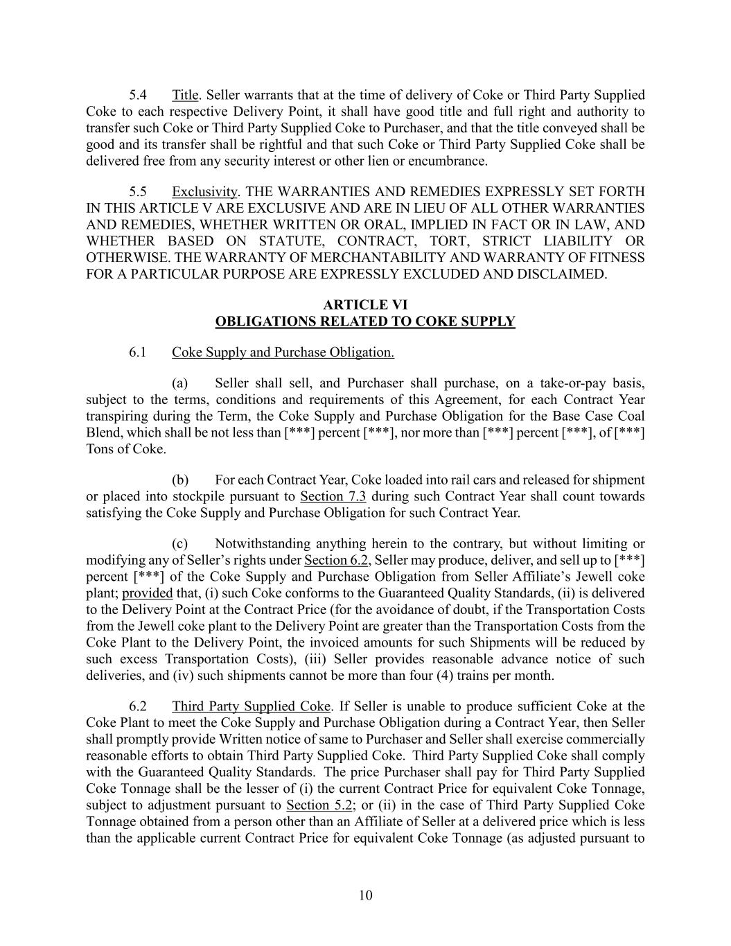 10 5.4 Title. Seller warrants that at the time of delivery of Coke or Third Party Supplied Coke to each respective Delivery Point, it shall have good title and full right and authority to transfer such Coke or Third Party Supplied Coke to Purchaser, and that the title conveyed shall be good and its transfer shall be rightful and that such Coke or Third Party Supplied Coke shall be delivered free from any security interest or other lien or encumbrance. 5.5 Exclusivity. THE WARRANTIES AND REMEDIES EXPRESSLY SET FORTH IN THIS ARTICLE V ARE EXCLUSIVE AND ARE IN LIEU OF ALL OTHER WARRANTIES AND REMEDIES, WHETHER WRITTEN OR ORAL, IMPLIED IN FACT OR IN LAW, AND WHETHER BASED ON STATUTE, CONTRACT, TORT, STRICT LIABILITY OR OTHERWISE. THE WARRANTY OF MERCHANTABILITY AND WARRANTY OF FITNESS FOR A PARTICULAR PURPOSE ARE EXPRESSLY EXCLUDED AND DISCLAIMED. ARTICLE VI OBLIGATIONS RELATED TO COKE SUPPLY 6.1 Coke Supply and Purchase Obligation. (a) Seller shall sell, and Purchaser shall purchase, on a take-or-pay basis, subject to the terms, conditions and requirements of this Agreement, for each Contract Year transpiring during the Term, the Coke Supply and Purchase Obligation for the Base Case Coal Blend, which shall be not less than [***] percent [***], nor more than [***] percent [***], of [***] Tons of Coke. (b) For each Contract Year, Coke loaded into rail cars and released for shipment or placed into stockpile pursuant to Section 7.3 during such Contract Year shall count towards satisfying the Coke Supply and Purchase Obligation for such Contract Year. (c) Notwithstanding anything herein to the contrary, but without limiting or modifying any of Seller’s rights under Section 6.2, Seller may produce, deliver, and sell up to [***] percent [***] of the Coke Supply and Purchase Obligation from Seller Affiliate’s Jewell coke plant; provided that, (i) such Coke conforms to the Guaranteed Quality Standards, (ii) is delivered to the Delivery Point at the Contract Price (for the avoidance of doubt, if the Transportation Costs from the Jewell coke plant to the Delivery Point are greater than the Transportation Costs from the Coke Plant to the Delivery Point, the invoiced amounts for such Shipments will be reduced by such excess Transportation Costs), (iii) Seller provides reasonable advance notice of such deliveries, and (iv) such shipments cannot be more than four (4) trains per month. 6.2 Third Party Supplied Coke. If Seller is unable to produce sufficient Coke at the Coke Plant to meet the Coke Supply and Purchase Obligation during a Contract Year, then Seller shall promptly provide Written notice of same to Purchaser and Seller shall exercise commercially reasonable efforts to obtain Third Party Supplied Coke. Third Party Supplied Coke shall comply with the Guaranteed Quality Standards. The price Purchaser shall pay for Third Party Supplied Coke Tonnage shall be the lesser of (i) the current Contract Price for equivalent Coke Tonnage, subject to adjustment pursuant to Section 5.2; or (ii) in the case of Third Party Supplied Coke Tonnage obtained from a person other than an Affiliate of Seller at a delivered price which is less than the applicable current Contract Price for equivalent Coke Tonnage (as adjusted pursuant to