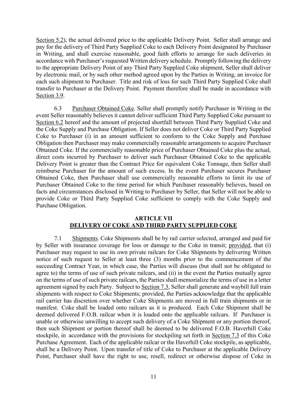 11 Section 5.2), the actual delivered price to the applicable Delivery Point. Seller shall arrange and pay for the delivery of Third Party Supplied Coke to each Delivery Point designated by Purchaser in Writing, and shall exercise reasonable, good faith efforts to arrange for such deliveries in accordance with Purchaser’s requested Written delivery schedule. Promptly following the delivery to the appropriate Delivery Point of any Third Party Supplied Coke shipment, Seller shall deliver by electronic mail, or by such other method agreed upon by the Parties in Writing, an invoice for each such shipment to Purchaser. Title and risk of loss for such Third Party Supplied Coke shall transfer to Purchaser at the Delivery Point. Payment therefore shall be made in accordance with Section 3.9. 6.3 Purchaser Obtained Coke. Seller shall promptly notify Purchaser in Writing in the event Seller reasonably believes it cannot deliver sufficient Third Party Supplied Coke pursuant to Section 6.2 hereof and the amount of projected shortfall between Third Party Supplied Coke and the Coke Supply and Purchase Obligation. If Seller does not deliver Coke or Third Party Supplied Coke to Purchaser (i) in an amount sufficient to conform to the Coke Supply and Purchase Obligation then Purchaser may make commercially reasonable arrangements to acquire Purchaser Obtained Coke. If the commercially reasonable price of Purchaser Obtained Coke plus the actual, direct costs incurred by Purchaser to deliver such Purchaser Obtained Coke to the applicable Delivery Point is greater than the Contract Price for equivalent Coke Tonnage, then Seller shall reimburse Purchaser for the amount of such excess. In the event Purchaser secures Purchaser Obtained Coke, then Purchaser shall use commercially reasonable efforts to limit its use of Purchaser Obtained Coke to the time period for which Purchaser reasonably believes, based on facts and circumstances disclosed in Writing to Purchaser by Seller, that Seller will not be able to provide Coke or Third Party Supplied Coke sufficient to comply with the Coke Supply and Purchase Obligation. ARTICLE VII DELIVERY OF COKE AND THIRD PARTY SUPPLIED COKE 7.1 Shipments. Coke Shipments shall be by rail carrier selected, arranged and paid for by Seller with insurance coverage for loss or damage to the Coke in transit; provided, that (i) Purchaser may request to use its own private railcars for Coke Shipments by delivering Written notice of such request to Seller at least three (3) months prior to the commencement of the succeeding Contract Year, in which case, the Parties will discuss (but shall not be obligated to agree to) the terms of use of such private railcars, and (ii) in the event the Parties mutually agree on the terms of use of such private railcars, the Parties shall memorialize the terms of use in a letter agreement signed by each Party. Subject to Section 7.3, Seller shall generate and waybill full train shipments with respect to Coke Shipments; provided, the Parties acknowledge that the applicable rail carrier has discretion over whether Coke Shipments are moved in full train shipments or in manifest. Coke shall be loaded onto railcars as it is produced. Each Coke Shipment shall be deemed delivered F.O.B. railcar when it is loaded onto the applicable railcars. If Purchaser is unable or otherwise unwilling to accept such delivery of a Coke Shipment or any portion thereof, then such Shipment or portion thereof shall be deemed to be delivered F.O.B. Haverhill Coke stockpile, in accordance with the provisions for stockpiling set forth in Section 7.3 of this Coke Purchase Agreement. Each of the applicable railcar or the Haverhill Coke stockpile, as applicable, shall be a Delivery Point. Upon transfer of title of Coke to Purchaser at the applicable Delivery Point, Purchaser shall have the right to use, resell, redirect or otherwise dispose of Coke in