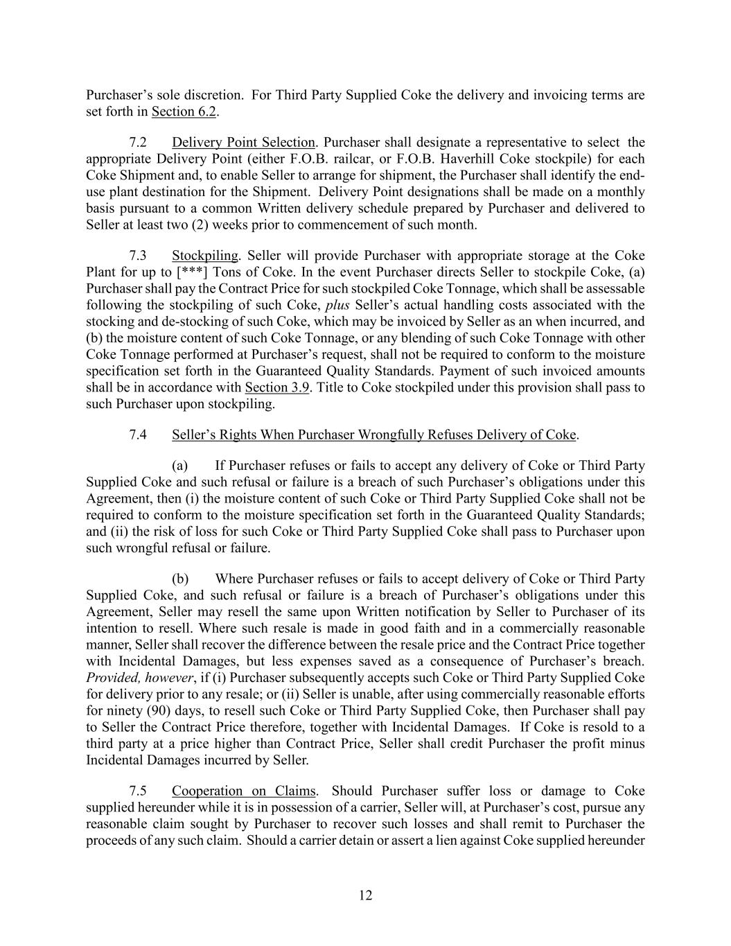 12 Purchaser’s sole discretion. For Third Party Supplied Coke the delivery and invoicing terms are set forth in Section 6.2. 7.2 Delivery Point Selection. Purchaser shall designate a representative to select the appropriate Delivery Point (either F.O.B. railcar, or F.O.B. Haverhill Coke stockpile) for each Coke Shipment and, to enable Seller to arrange for shipment, the Purchaser shall identify the end- use plant destination for the Shipment. Delivery Point designations shall be made on a monthly basis pursuant to a common Written delivery schedule prepared by Purchaser and delivered to Seller at least two (2) weeks prior to commencement of such month. 7.3 Stockpiling. Seller will provide Purchaser with appropriate storage at the Coke Plant for up to [***] Tons of Coke. In the event Purchaser directs Seller to stockpile Coke, (a) Purchaser shall pay the Contract Price for such stockpiled Coke Tonnage, which shall be assessable following the stockpiling of such Coke, plus Seller’s actual handling costs associated with the stocking and de-stocking of such Coke, which may be invoiced by Seller as an when incurred, and (b) the moisture content of such Coke Tonnage, or any blending of such Coke Tonnage with other Coke Tonnage performed at Purchaser’s request, shall not be required to conform to the moisture specification set forth in the Guaranteed Quality Standards. Payment of such invoiced amounts shall be in accordance with Section 3.9. Title to Coke stockpiled under this provision shall pass to such Purchaser upon stockpiling. 7.4 Seller’s Rights When Purchaser Wrongfully Refuses Delivery of Coke. (a) If Purchaser refuses or fails to accept any delivery of Coke or Third Party Supplied Coke and such refusal or failure is a breach of such Purchaser’s obligations under this Agreement, then (i) the moisture content of such Coke or Third Party Supplied Coke shall not be required to conform to the moisture specification set forth in the Guaranteed Quality Standards; and (ii) the risk of loss for such Coke or Third Party Supplied Coke shall pass to Purchaser upon such wrongful refusal or failure. (b) Where Purchaser refuses or fails to accept delivery of Coke or Third Party Supplied Coke, and such refusal or failure is a breach of Purchaser’s obligations under this Agreement, Seller may resell the same upon Written notification by Seller to Purchaser of its intention to resell. Where such resale is made in good faith and in a commercially reasonable manner, Seller shall recover the difference between the resale price and the Contract Price together with Incidental Damages, but less expenses saved as a consequence of Purchaser’s breach. Provided, however, if (i) Purchaser subsequently accepts such Coke or Third Party Supplied Coke for delivery prior to any resale; or (ii) Seller is unable, after using commercially reasonable efforts for ninety (90) days, to resell such Coke or Third Party Supplied Coke, then Purchaser shall pay to Seller the Contract Price therefore, together with Incidental Damages. If Coke is resold to a third party at a price higher than Contract Price, Seller shall credit Purchaser the profit minus Incidental Damages incurred by Seller. 7.5 Cooperation on Claims. Should Purchaser suffer loss or damage to Coke supplied hereunder while it is in possession of a carrier, Seller will, at Purchaser’s cost, pursue any reasonable claim sought by Purchaser to recover such losses and shall remit to Purchaser the proceeds of any such claim. Should a carrier detain or assert a lien against Coke supplied hereunder