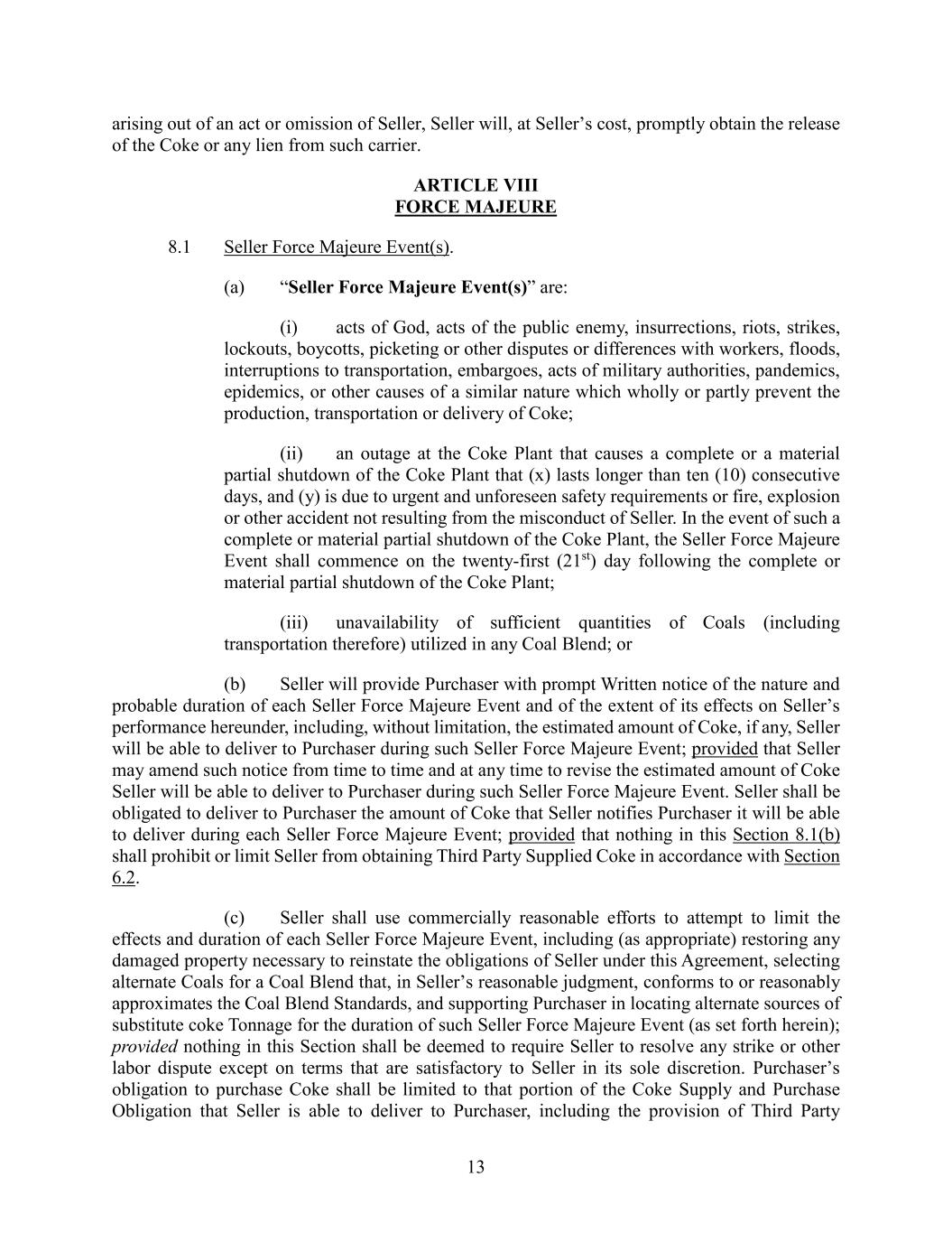 13 arising out of an act or omission of Seller, Seller will, at Seller’s cost, promptly obtain the release of the Coke or any lien from such carrier. ARTICLE VIII FORCE MAJEURE 8.1 Seller Force Majeure Event(s). (a) “Seller Force Majeure Event(s)” are: (i) acts of God, acts of the public enemy, insurrections, riots, strikes, lockouts, boycotts, picketing or other disputes or differences with workers, floods, interruptions to transportation, embargoes, acts of military authorities, pandemics, epidemics, or other causes of a similar nature which wholly or partly prevent the production, transportation or delivery of Coke; (ii) an outage at the Coke Plant that causes a complete or a material partial shutdown of the Coke Plant that (x) lasts longer than ten (10) consecutive days, and (y) is due to urgent and unforeseen safety requirements or fire, explosion or other accident not resulting from the misconduct of Seller. In the event of such a complete or material partial shutdown of the Coke Plant, the Seller Force Majeure Event shall commence on the twenty-first (21st) day following the complete or material partial shutdown of the Coke Plant; (iii) unavailability of sufficient quantities of Coals (including transportation therefore) utilized in any Coal Blend; or (b) Seller will provide Purchaser with prompt Written notice of the nature and probable duration of each Seller Force Majeure Event and of the extent of its effects on Seller’s performance hereunder, including, without limitation, the estimated amount of Coke, if any, Seller will be able to deliver to Purchaser during such Seller Force Majeure Event; provided that Seller may amend such notice from time to time and at any time to revise the estimated amount of Coke Seller will be able to deliver to Purchaser during such Seller Force Majeure Event. Seller shall be obligated to deliver to Purchaser the amount of Coke that Seller notifies Purchaser it will be able to deliver during each Seller Force Majeure Event; provided that nothing in this Section 8.1(b) shall prohibit or limit Seller from obtaining Third Party Supplied Coke in accordance with Section 6.2. (c) Seller shall use commercially reasonable efforts to attempt to limit the effects and duration of each Seller Force Majeure Event, including (as appropriate) restoring any damaged property necessary to reinstate the obligations of Seller under this Agreement, selecting alternate Coals for a Coal Blend that, in Seller’s reasonable judgment, conforms to or reasonably approximates the Coal Blend Standards, and supporting Purchaser in locating alternate sources of substitute coke Tonnage for the duration of such Seller Force Majeure Event (as set forth herein); provided nothing in this Section shall be deemed to require Seller to resolve any strike or other labor dispute except on terms that are satisfactory to Seller in its sole discretion. Purchaser’s obligation to purchase Coke shall be limited to that portion of the Coke Supply and Purchase Obligation that Seller is able to deliver to Purchaser, including the provision of Third Party