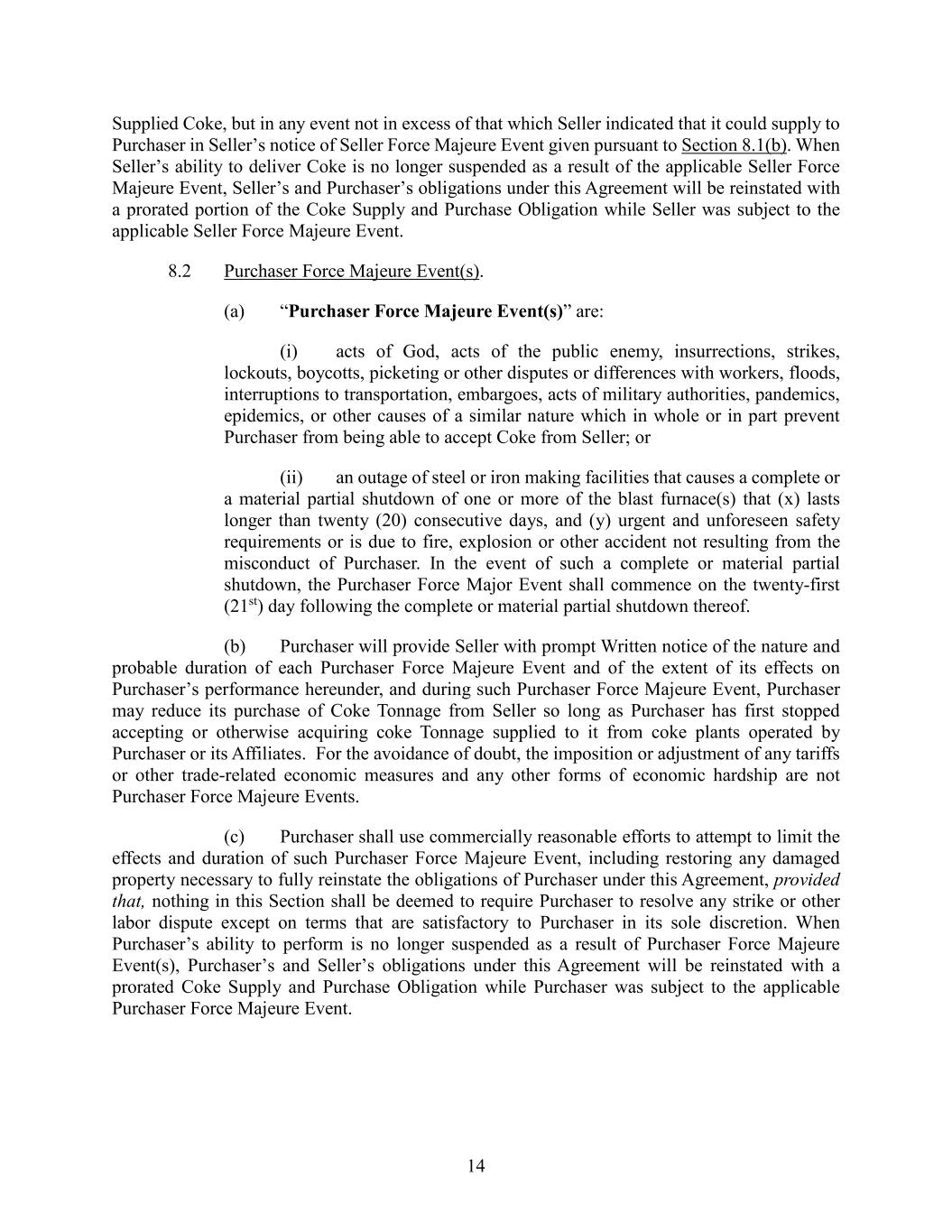 14 Supplied Coke, but in any event not in excess of that which Seller indicated that it could supply to Purchaser in Seller’s notice of Seller Force Majeure Event given pursuant to Section 8.1(b). When Seller’s ability to deliver Coke is no longer suspended as a result of the applicable Seller Force Majeure Event, Seller’s and Purchaser’s obligations under this Agreement will be reinstated with a prorated portion of the Coke Supply and Purchase Obligation while Seller was subject to the applicable Seller Force Majeure Event. 8.2 Purchaser Force Majeure Event(s). (a) “Purchaser Force Majeure Event(s)” are: (i) acts of God, acts of the public enemy, insurrections, strikes, lockouts, boycotts, picketing or other disputes or differences with workers, floods, interruptions to transportation, embargoes, acts of military authorities, pandemics, epidemics, or other causes of a similar nature which in whole or in part prevent Purchaser from being able to accept Coke from Seller; or (ii) an outage of steel or iron making facilities that causes a complete or a material partial shutdown of one or more of the blast furnace(s) that (x) lasts longer than twenty (20) consecutive days, and (y) urgent and unforeseen safety requirements or is due to fire, explosion or other accident not resulting from the misconduct of Purchaser. In the event of such a complete or material partial shutdown, the Purchaser Force Major Event shall commence on the twenty-first (21st) day following the complete or material partial shutdown thereof. (b) Purchaser will provide Seller with prompt Written notice of the nature and probable duration of each Purchaser Force Majeure Event and of the extent of its effects on Purchaser’s performance hereunder, and during such Purchaser Force Majeure Event, Purchaser may reduce its purchase of Coke Tonnage from Seller so long as Purchaser has first stopped accepting or otherwise acquiring coke Tonnage supplied to it from coke plants operated by Purchaser or its Affiliates. For the avoidance of doubt, the imposition or adjustment of any tariffs or other trade-related economic measures and any other forms of economic hardship are not Purchaser Force Majeure Events. (c) Purchaser shall use commercially reasonable efforts to attempt to limit the effects and duration of such Purchaser Force Majeure Event, including restoring any damaged property necessary to fully reinstate the obligations of Purchaser under this Agreement, provided that, nothing in this Section shall be deemed to require Purchaser to resolve any strike or other labor dispute except on terms that are satisfactory to Purchaser in its sole discretion. When Purchaser’s ability to perform is no longer suspended as a result of Purchaser Force Majeure Event(s), Purchaser’s and Seller’s obligations under this Agreement will be reinstated with a prorated Coke Supply and Purchase Obligation while Purchaser was subject to the applicable Purchaser Force Majeure Event.