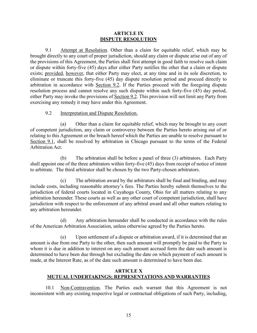 15 ARTICLE IX DISPUTE RESOLUTION 9.1 Attempt at Resolution. Other than a claim for equitable relief, which may be brought directly to any court of proper jurisdiction, should any claim or dispute arise out of any of the provisions of this Agreement, the Parties shall first attempt in good faith to resolve such claim or dispute within forty-five (45) days after either Party notifies the other that a claim or dispute exists; provided, however, that either Party may elect, at any time and in its sole discretion, to eliminate or truncate this forty-five (45) day dispute resolution period and proceed directly to arbitration in accordance with Section 9.2. If the Parties proceed with the foregoing dispute resolution process and cannot resolve any such dispute within such forty-five (45) day period, either Party may invoke the provisions of Section 9.2. This provision will not limit any Party from exercising any remedy it may have under this Agreement. 9.2 Interpretation and Dispute Resolution. (a) Other than a claim for equitable relief, which may be brought to any court of competent jurisdiction, any claim or controversy between the Parties hereto arising out of or relating to this Agreement or the breach hereof which the Parties are unable to resolve pursuant to Section 9.1, shall be resolved by arbitration in Chicago pursuant to the terms of the Federal Arbitration Act. (b) The arbitration shall be before a panel of three (3) arbitrators. Each Party shall appoint one of the three arbitrators within forty-five (45) days from receipt of notice of intent to arbitrate. The third arbitrator shall be chosen by the two Party-chosen arbitrators. (c) The arbitration award by the arbitrators shall be final and binding, and may include costs, including reasonable attorney’s fees. The Parties hereby submit themselves to the jurisdiction of federal courts located in Cuyahoga County, Ohio for all matters relating to any arbitration hereunder. These courts as well as any other court of competent jurisdiction, shall have jurisdiction with respect to the enforcement of any arbitral award and all other matters relating to any arbitration hereunder. (d) Any arbitration hereunder shall be conducted in accordance with the rules of the American Arbitration Association, unless otherwise agreed by the Parties hereto. (e) Upon settlement of a dispute or arbitration award, if it is determined that an amount is due from one Party to the other, then such amount will promptly be paid to the Party to whom it is due in addition to interest on any such amount accrued form the date such amount is determined to have been due through but excluding the date on which payment of such amount is made, at the Interest Rate, as of the date such amount is determined to have been due. ARTICLE X MUTUAL UNDERTAKINGS; REPRESENTATIONS AND WARRANTIES 10.1 Non-Contravention. The Parties each warrant that this Agreement is not inconsistent with any existing respective legal or contractual obligations of such Party, including,