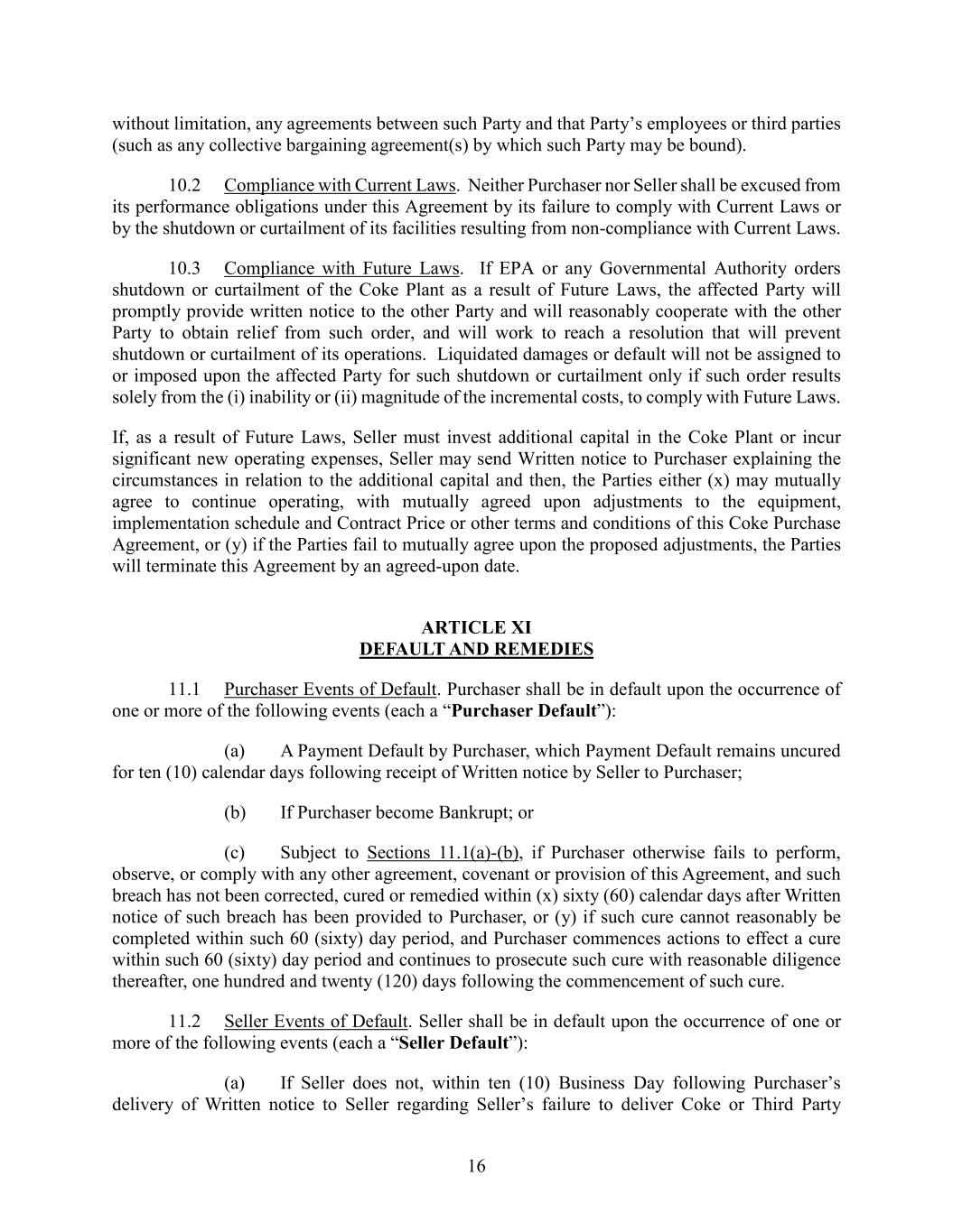 16 without limitation, any agreements between such Party and that Party’s employees or third parties (such as any collective bargaining agreement(s) by which such Party may be bound). 10.2 Compliance with Current Laws. Neither Purchaser nor Seller shall be excused from its performance obligations under this Agreement by its failure to comply with Current Laws or by the shutdown or curtailment of its facilities resulting from non-compliance with Current Laws. 10.3 Compliance with Future Laws. If EPA or any Governmental Authority orders shutdown or curtailment of the Coke Plant as a result of Future Laws, the affected Party will promptly provide written notice to the other Party and will reasonably cooperate with the other Party to obtain relief from such order, and will work to reach a resolution that will prevent shutdown or curtailment of its operations. Liquidated damages or default will not be assigned to or imposed upon the affected Party for such shutdown or curtailment only if such order results solely from the (i) inability or (ii) magnitude of the incremental costs, to comply with Future Laws. If, as a result of Future Laws, Seller must invest additional capital in the Coke Plant or incur significant new operating expenses, Seller may send Written notice to Purchaser explaining the circumstances in relation to the additional capital and then, the Parties either (x) may mutually agree to continue operating, with mutually agreed upon adjustments to the equipment, implementation schedule and Contract Price or other terms and conditions of this Coke Purchase Agreement, or (y) if the Parties fail to mutually agree upon the proposed adjustments, the Parties will terminate this Agreement by an agreed-upon date. ARTICLE XI DEFAULT AND REMEDIES 11.1 Purchaser Events of Default. Purchaser shall be in default upon the occurrence of one or more of the following events (each a “Purchaser Default”): (a) A Payment Default by Purchaser, which Payment Default remains uncured for ten (10) calendar days following receipt of Written notice by Seller to Purchaser; (b) If Purchaser become Bankrupt; or (c) Subject to Sections 11.1(a)-(b), if Purchaser otherwise fails to perform, observe, or comply with any other agreement, covenant or provision of this Agreement, and such breach has not been corrected, cured or remedied within (x) sixty (60) calendar days after Written notice of such breach has been provided to Purchaser, or (y) if such cure cannot reasonably be completed within such 60 (sixty) day period, and Purchaser commences actions to effect a cure within such 60 (sixty) day period and continues to prosecute such cure with reasonable diligence thereafter, one hundred and twenty (120) days following the commencement of such cure. 11.2 Seller Events of Default. Seller shall be in default upon the occurrence of one or more of the following events (each a “Seller Default”): (a) If Seller does not, within ten (10) Business Day following Purchaser’s delivery of Written notice to Seller regarding Seller’s failure to deliver Coke or Third Party