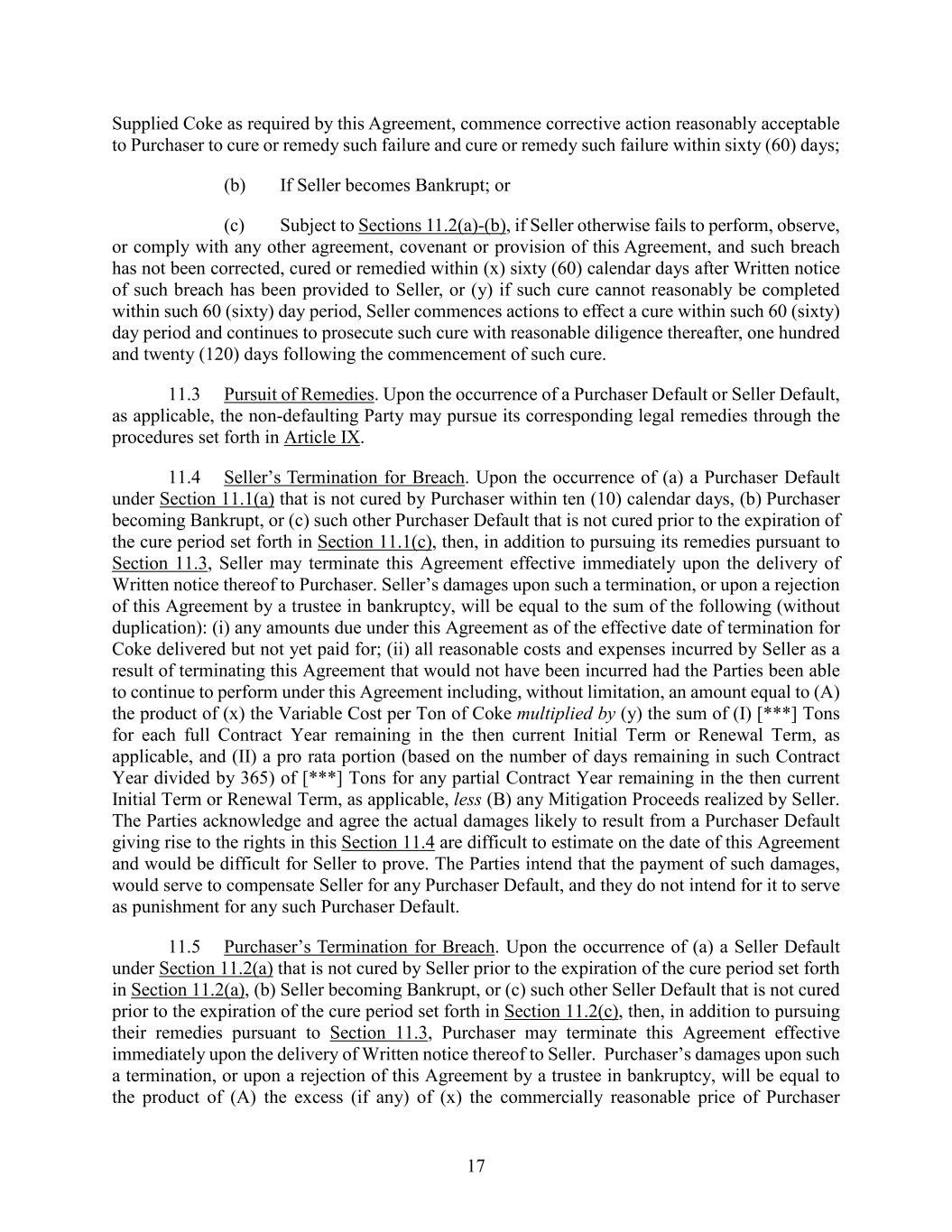 17 Supplied Coke as required by this Agreement, commence corrective action reasonably acceptable to Purchaser to cure or remedy such failure and cure or remedy such failure within sixty (60) days; (b) If Seller becomes Bankrupt; or (c) Subject to Sections 11.2(a)-(b), if Seller otherwise fails to perform, observe, or comply with any other agreement, covenant or provision of this Agreement, and such breach has not been corrected, cured or remedied within (x) sixty (60) calendar days after Written notice of such breach has been provided to Seller, or (y) if such cure cannot reasonably be completed within such 60 (sixty) day period, Seller commences actions to effect a cure within such 60 (sixty) day period and continues to prosecute such cure with reasonable diligence thereafter, one hundred and twenty (120) days following the commencement of such cure. 11.3 Pursuit of Remedies. Upon the occurrence of a Purchaser Default or Seller Default, as applicable, the non-defaulting Party may pursue its corresponding legal remedies through the procedures set forth in Article IX. 11.4 Seller’s Termination for Breach. Upon the occurrence of (a) a Purchaser Default under Section 11.1(a) that is not cured by Purchaser within ten (10) calendar days, (b) Purchaser becoming Bankrupt, or (c) such other Purchaser Default that is not cured prior to the expiration of the cure period set forth in Section 11.1(c), then, in addition to pursuing its remedies pursuant to Section 11.3, Seller may terminate this Agreement effective immediately upon the delivery of Written notice thereof to Purchaser. Seller’s damages upon such a termination, or upon a rejection of this Agreement by a trustee in bankruptcy, will be equal to the sum of the following (without duplication): (i) any amounts due under this Agreement as of the effective date of termination for Coke delivered but not yet paid for; (ii) all reasonable costs and expenses incurred by Seller as a result of terminating this Agreement that would not have been incurred had the Parties been able to continue to perform under this Agreement including, without limitation, an amount equal to (A) the product of (x) the Variable Cost per Ton of Coke multiplied by (y) the sum of (I) [***] Tons for each full Contract Year remaining in the then current Initial Term or Renewal Term, as applicable, and (II) a pro rata portion (based on the number of days remaining in such Contract Year divided by 365) of [***] Tons for any partial Contract Year remaining in the then current Initial Term or Renewal Term, as applicable, less (B) any Mitigation Proceeds realized by Seller. The Parties acknowledge and agree the actual damages likely to result from a Purchaser Default giving rise to the rights in this Section 11.4 are difficult to estimate on the date of this Agreement and would be difficult for Seller to prove. The Parties intend that the payment of such damages, would serve to compensate Seller for any Purchaser Default, and they do not intend for it to serve as punishment for any such Purchaser Default. 11.5 Purchaser’s Termination for Breach. Upon the occurrence of (a) a Seller Default under Section 11.2(a) that is not cured by Seller prior to the expiration of the cure period set forth in Section 11.2(a), (b) Seller becoming Bankrupt, or (c) such other Seller Default that is not cured prior to the expiration of the cure period set forth in Section 11.2(c), then, in addition to pursuing their remedies pursuant to Section 11.3, Purchaser may terminate this Agreement effective immediately upon the delivery of Written notice thereof to Seller. Purchaser’s damages upon such a termination, or upon a rejection of this Agreement by a trustee in bankruptcy, will be equal to the product of (A) the excess (if any) of (x) the commercially reasonable price of Purchaser