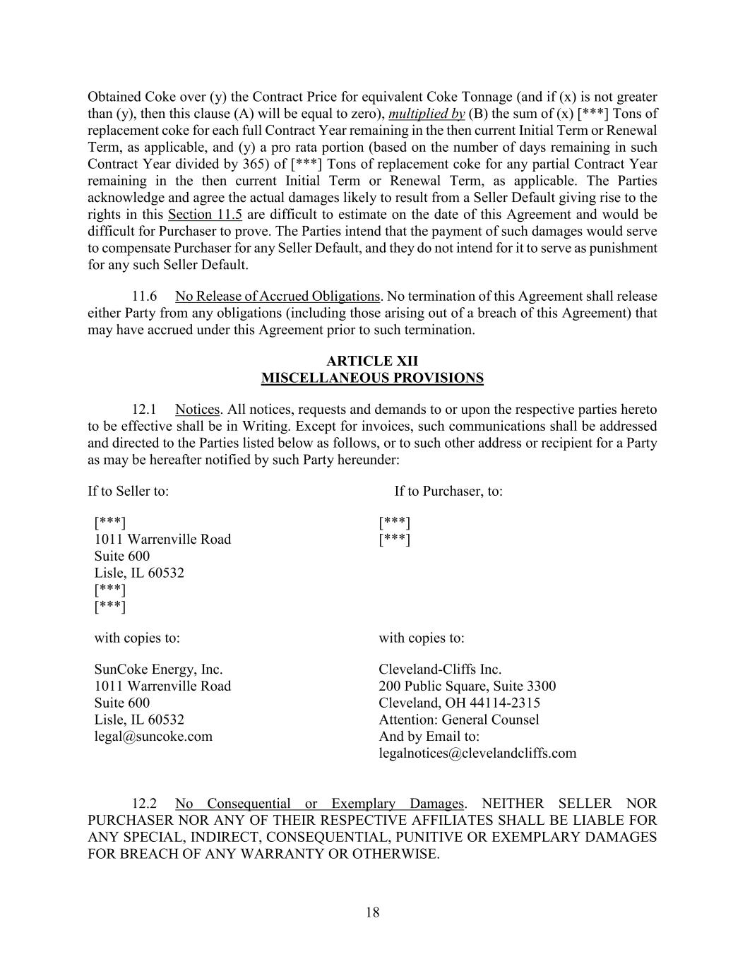 18 Obtained Coke over (y) the Contract Price for equivalent Coke Tonnage (and if (x) is not greater than (y), then this clause (A) will be equal to zero), multiplied by (B) the sum of (x) [***] Tons of replacement coke for each full Contract Year remaining in the then current Initial Term or Renewal Term, as applicable, and (y) a pro rata portion (based on the number of days remaining in such Contract Year divided by 365) of [***] Tons of replacement coke for any partial Contract Year remaining in the then current Initial Term or Renewal Term, as applicable. The Parties acknowledge and agree the actual damages likely to result from a Seller Default giving rise to the rights in this Section 11.5 are difficult to estimate on the date of this Agreement and would be difficult for Purchaser to prove. The Parties intend that the payment of such damages would serve to compensate Purchaser for any Seller Default, and they do not intend for it to serve as punishment for any such Seller Default. 11.6 No Release of Accrued Obligations. No termination of this Agreement shall release either Party from any obligations (including those arising out of a breach of this Agreement) that may have accrued under this Agreement prior to such termination. ARTICLE XII MISCELLANEOUS PROVISIONS 12.1 Notices. All notices, requests and demands to or upon the respective parties hereto to be effective shall be in Writing. Except for invoices, such communications shall be addressed and directed to the Parties listed below as follows, or to such other address or recipient for a Party as may be hereafter notified by such Party hereunder: If to Seller to: If to Purchaser, to: [***] 1011 Warrenville Road Suite 600 Lisle, IL 60532 [***] [***] [***] [***] with copies to: with copies to: SunCoke Energy, Inc. 1011 Warrenville Road Suite 600 Lisle, IL 60532 legal@suncoke.com Cleveland-Cliffs Inc. 200 Public Square, Suite 3300 Cleveland, OH 44114-2315 Attention: General Counsel And by Email to: legalnotices@clevelandcliffs.com 12.2 No Consequential or Exemplary Damages. NEITHER SELLER NOR PURCHASER NOR ANY OF THEIR RESPECTIVE AFFILIATES SHALL BE LIABLE FOR ANY SPECIAL, INDIRECT, CONSEQUENTIAL, PUNITIVE OR EXEMPLARY DAMAGES FOR BREACH OF ANY WARRANTY OR OTHERWISE.