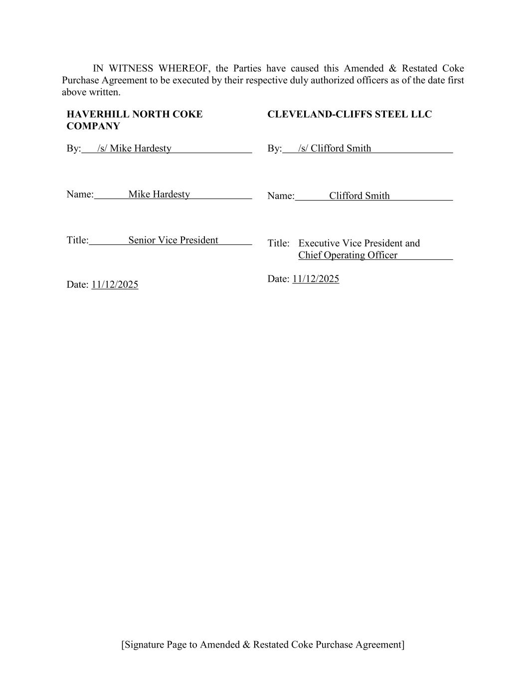[Signature Page to Amended & Restated Coke Purchase Agreement] IN WITNESS WHEREOF, the Parties have caused this Amended & Restated Coke Purchase Agreement to be executed by their respective duly authorized officers as of the date first above written. HAVERHILL NORTH COKE COMPANY CLEVELAND-CLIFFS STEEL LLC By: /s/ Mike Hardesty Name: Mike Hardesty Title: Senior Vice President Date: 11/12/2025 By: /s/ Clifford Smith Name: Clifford Smith Title: Executive Vice President and Chief Operating Officer Date: 11/12/2025