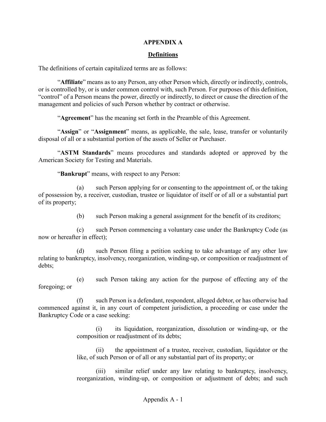 Appendix A - 1 APPENDIX A Definitions The definitions of certain capitalized terms are as follows: “Affiliate” means as to any Person, any other Person which, directly or indirectly, controls, or is controlled by, or is under common control with, such Person. For purposes of this definition, “control” of a Person means the power, directly or indirectly, to direct or cause the direction of the management and policies of such Person whether by contract or otherwise. “Agreement” has the meaning set forth in the Preamble of this Agreement. “Assign” or “Assignment” means, as applicable, the sale, lease, transfer or voluntarily disposal of all or a substantial portion of the assets of Seller or Purchaser. “ASTM Standards” means procedures and standards adopted or approved by the American Society for Testing and Materials. “Bankrupt” means, with respect to any Person: (a) such Person applying for or consenting to the appointment of, or the taking of possession by, a receiver, custodian, trustee or liquidator of itself or of all or a substantial part of its property; (b) such Person making a general assignment for the benefit of its creditors; (c) such Person commencing a voluntary case under the Bankruptcy Code (as now or hereafter in effect); (d) such Person filing a petition seeking to take advantage of any other law relating to bankruptcy, insolvency, reorganization, winding-up, or composition or readjustment of debts; (e) such Person taking any action for the purpose of effecting any of the foregoing; or (f) such Person is a defendant, respondent, alleged debtor, or has otherwise had commenced against it, in any court of competent jurisdiction, a proceeding or case under the Bankruptcy Code or a case seeking: (i) its liquidation, reorganization, dissolution or winding-up, or the composition or readjustment of its debts; (ii) the appointment of a trustee, receiver, custodian, liquidator or the like, of such Person or of all or any substantial part of its property; or (iii) similar relief under any law relating to bankruptcy, insolvency, reorganization, winding-up, or composition or adjustment of debts; and such