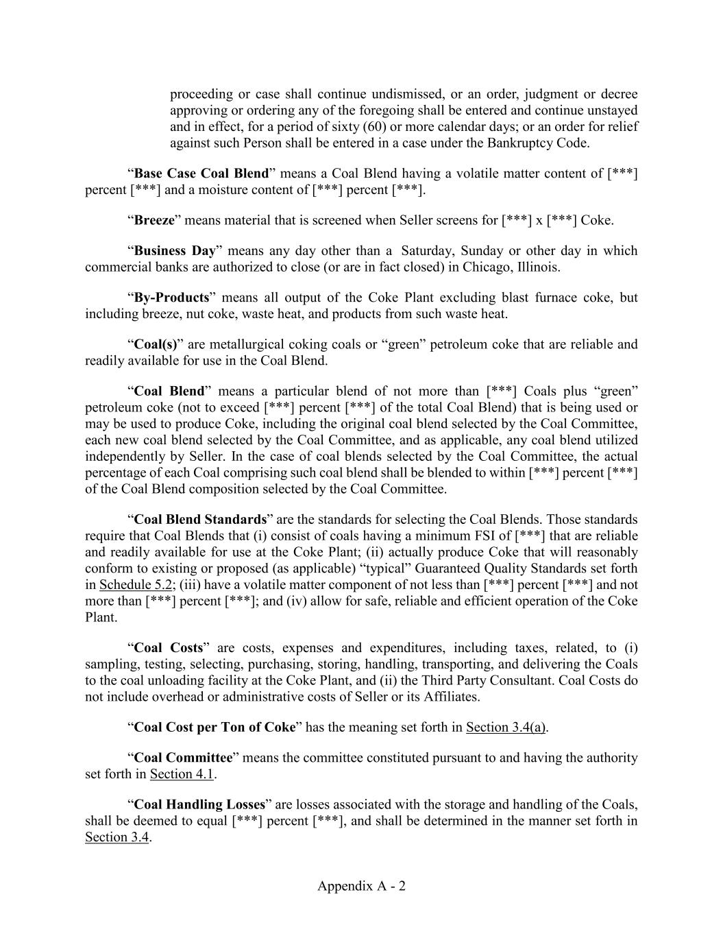 Appendix A - 2 proceeding or case shall continue undismissed, or an order, judgment or decree approving or ordering any of the foregoing shall be entered and continue unstayed and in effect, for a period of sixty (60) or more calendar days; or an order for relief against such Person shall be entered in a case under the Bankruptcy Code. “Base Case Coal Blend” means a Coal Blend having a volatile matter content of [***] percent [***] and a moisture content of [***] percent [***]. “Breeze” means material that is screened when Seller screens for [***] x [***] Coke. “Business Day” means any day other than a Saturday, Sunday or other day in which commercial banks are authorized to close (or are in fact closed) in Chicago, Illinois. “By-Products” means all output of the Coke Plant excluding blast furnace coke, but including breeze, nut coke, waste heat, and products from such waste heat. “Coal(s)” are metallurgical coking coals or “green” petroleum coke that are reliable and readily available for use in the Coal Blend. “Coal Blend” means a particular blend of not more than [***] Coals plus “green” petroleum coke (not to exceed [***] percent [***] of the total Coal Blend) that is being used or may be used to produce Coke, including the original coal blend selected by the Coal Committee, each new coal blend selected by the Coal Committee, and as applicable, any coal blend utilized independently by Seller. In the case of coal blends selected by the Coal Committee, the actual percentage of each Coal comprising such coal blend shall be blended to within [***] percent [***] of the Coal Blend composition selected by the Coal Committee. “Coal Blend Standards” are the standards for selecting the Coal Blends. Those standards require that Coal Blends that (i) consist of coals having a minimum FSI of [***] that are reliable and readily available for use at the Coke Plant; (ii) actually produce Coke that will reasonably conform to existing or proposed (as applicable) “typical” Guaranteed Quality Standards set forth in Schedule 5.2; (iii) have a volatile matter component of not less than [***] percent [***] and not more than [***] percent [***]; and (iv) allow for safe, reliable and efficient operation of the Coke Plant. “Coal Costs” are costs, expenses and expenditures, including taxes, related, to (i) sampling, testing, selecting, purchasing, storing, handling, transporting, and delivering the Coals to the coal unloading facility at the Coke Plant, and (ii) the Third Party Consultant. Coal Costs do not include overhead or administrative costs of Seller or its Affiliates. “Coal Cost per Ton of Coke” has the meaning set forth in Section 3.4(a). “Coal Committee” means the committee constituted pursuant to and having the authority set forth in Section 4.1. “Coal Handling Losses” are losses associated with the storage and handling of the Coals, shall be deemed to equal [***] percent [***], and shall be determined in the manner set forth in Section 3.4.