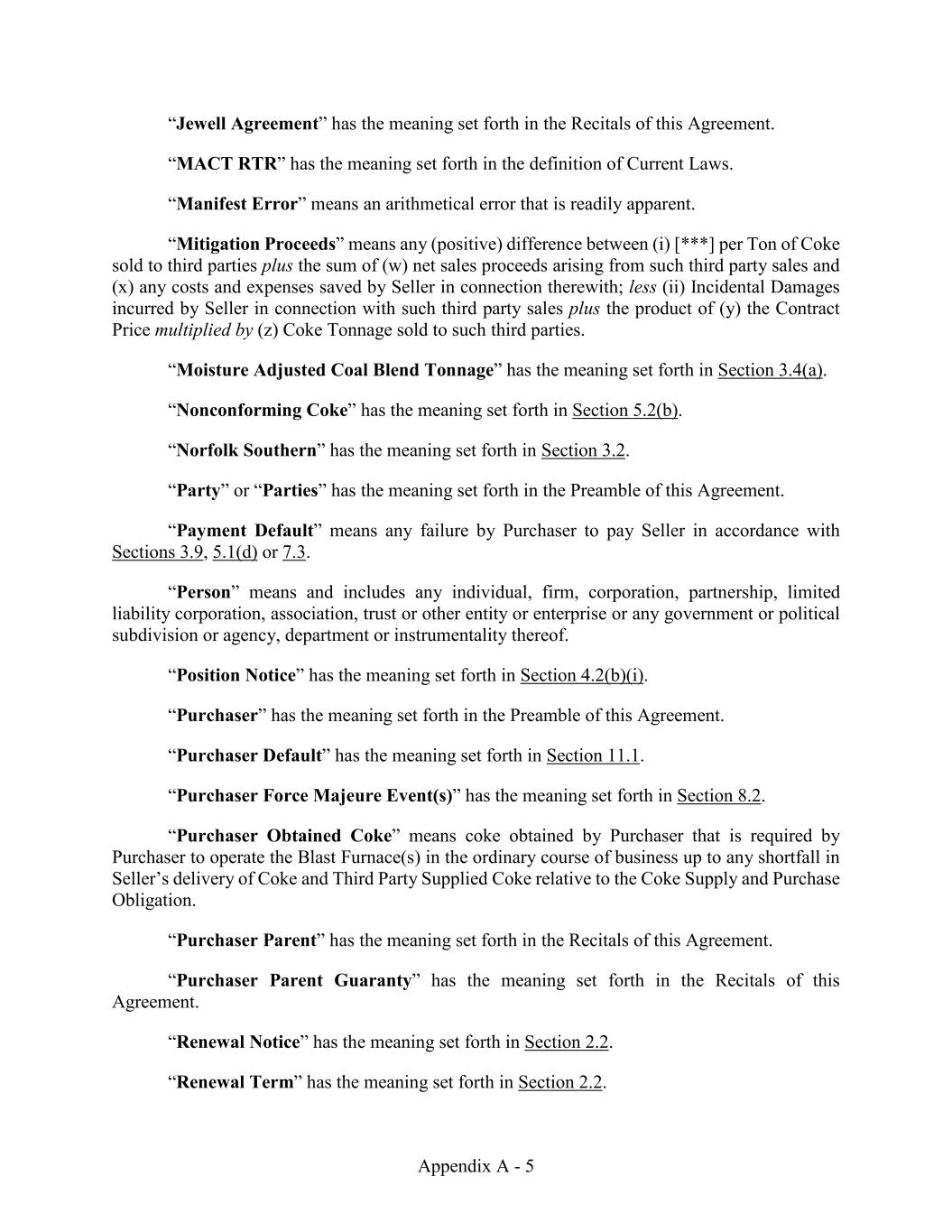 Appendix A - 5 “Jewell Agreement” has the meaning set forth in the Recitals of this Agreement. “MACT RTR” has the meaning set forth in the definition of Current Laws. “Manifest Error” means an arithmetical error that is readily apparent. “Mitigation Proceeds” means any (positive) difference between (i) [***] per Ton of Coke sold to third parties plus the sum of (w) net sales proceeds arising from such third party sales and (x) any costs and expenses saved by Seller in connection therewith; less (ii) Incidental Damages incurred by Seller in connection with such third party sales plus the product of (y) the Contract Price multiplied by (z) Coke Tonnage sold to such third parties. “Moisture Adjusted Coal Blend Tonnage” has the meaning set forth in Section 3.4(a). “Nonconforming Coke” has the meaning set forth in Section 5.2(b). “Norfolk Southern” has the meaning set forth in Section 3.2. “Party” or “Parties” has the meaning set forth in the Preamble of this Agreement. “Payment Default” means any failure by Purchaser to pay Seller in accordance with Sections 3.9, 5.1(d) or 7.3. “Person” means and includes any individual, firm, corporation, partnership, limited liability corporation, association, trust or other entity or enterprise or any government or political subdivision or agency, department or instrumentality thereof. “Position Notice” has the meaning set forth in Section 4.2(b)(i). “Purchaser” has the meaning set forth in the Preamble of this Agreement. “Purchaser Default” has the meaning set forth in Section 11.1. “Purchaser Force Majeure Event(s)” has the meaning set forth in Section 8.2. “Purchaser Obtained Coke” means coke obtained by Purchaser that is required by Purchaser to operate the Blast Furnace(s) in the ordinary course of business up to any shortfall in Seller’s delivery of Coke and Third Party Supplied Coke relative to the Coke Supply and Purchase Obligation. “Purchaser Parent” has the meaning set forth in the Recitals of this Agreement. “Purchaser Parent Guaranty” has the meaning set forth in the Recitals of this Agreement. “Renewal Notice” has the meaning set forth in Section 2.2. “Renewal Term” has the meaning set forth in Section 2.2.