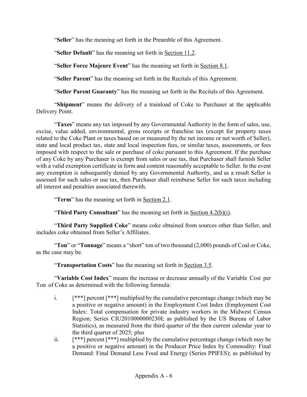 Appendix A - 6 “Seller” has the meaning set forth in the Preamble of this Agreement. “Seller Default” has the meaning set forth in Section 11.2. “Seller Force Majeure Event” has the meaning set forth in Section 8.1. “Seller Parent” has the meaning set forth in the Recitals of this Agreement. “Seller Parent Guaranty” has the meaning set forth in the Recitals of this Agreement. “Shipment” means the delivery of a trainload of Coke to Purchaser at the applicable Delivery Point. “Taxes” means any tax imposed by any Governmental Authority in the form of sales, use, excise, value added, environmental, gross receipts or franchise tax (except for property taxes related to the Coke Plant or taxes based on or measured by the net income or net worth of Seller), state and local product tax, state and local inspection fees, or similar taxes, assessments, or fees imposed with respect to the sale or purchase of coke pursuant to this Agreement. If the purchase of any Coke by any Purchaser is exempt from sales or use tax, that Purchaser shall furnish Seller with a valid exemption certificate in form and content reasonably acceptable to Seller. In the event any exemption is subsequently denied by any Governmental Authority, and as a result Seller is assessed for such sales or use tax, then Purchaser shall reimburse Seller for such taxes including all interest and penalties associated therewith. “Term” has the meaning set forth in Section 2.1. “Third Party Consultant” has the meaning set forth in Section 4.2(b)(i). “Third Party Supplied Coke” means coke obtained from sources other than Seller, and includes coke obtained from Seller’s Affiliates. “Ton” or “Tonnage” means a “short” ton of two thousand (2,000) pounds of Coal or Coke, as the case may be. “Transportation Costs” has the meaning set forth in Section 3.5. “Variable Cost Index” means the increase or decrease annually of the Variable Cost per Ton of Coke as determined with the following formula: i. [***] percent [***] multiplied by the cumulative percentage change (which may be a positive or negative amount) in the Employment Cost Index (Employment Cost Index: Total compensation for private industry workers in the Midwest Census Region; Series CIU2010000000230I; as published by the US Bureau of Labor Statistics), as measured from the third quarter of the then current calendar year to the third quarter of 2025; plus ii. [***] percent [***] multiplied by the cumulative percentage change (which may be a positive or negative amount) in the Producer Price Index by Commodity: Final Demand: Final Demand Less Food and Energy (Series PPIFES); as published by
