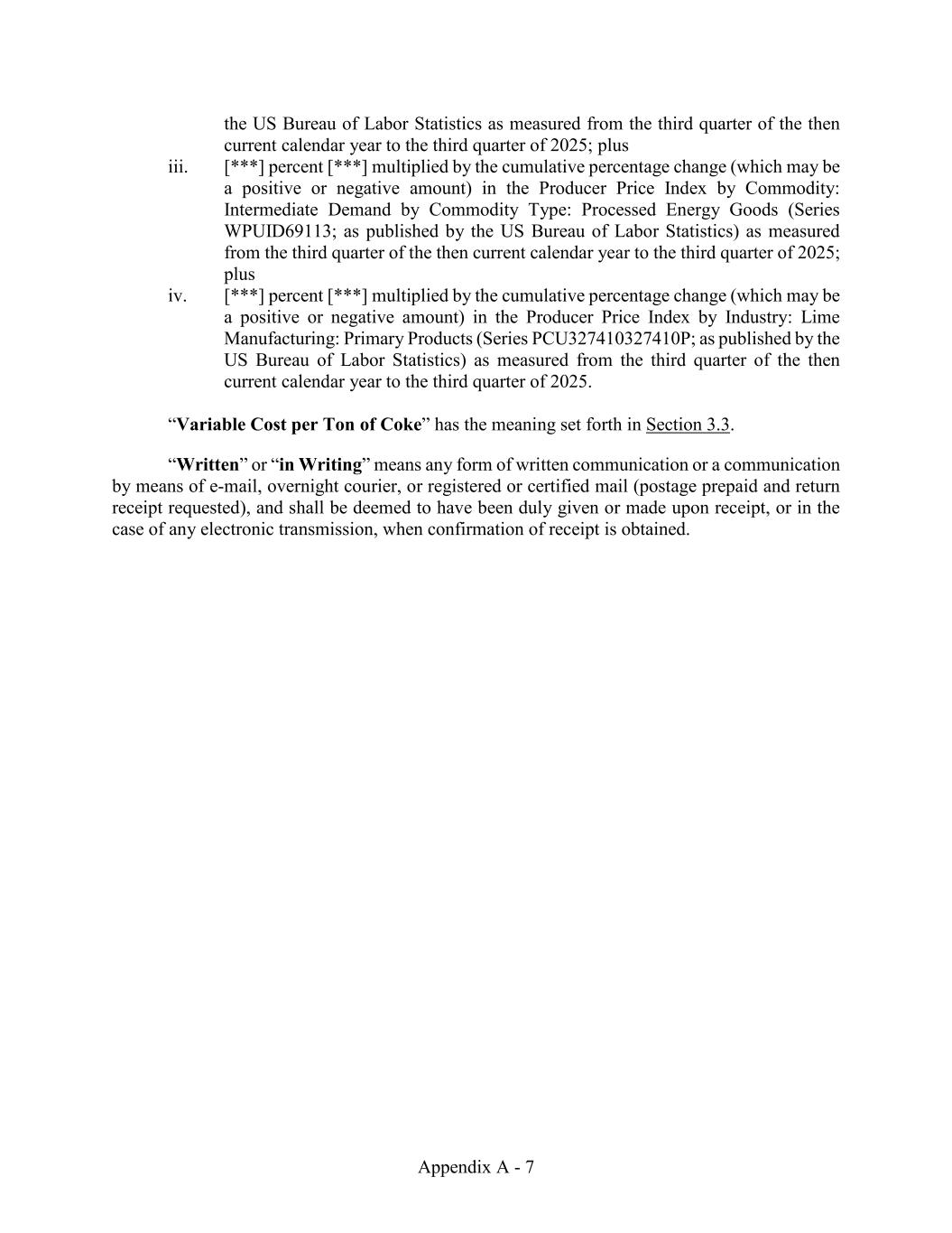Appendix A - 7 the US Bureau of Labor Statistics as measured from the third quarter of the then current calendar year to the third quarter of 2025; plus iii. [***] percent [***] multiplied by the cumulative percentage change (which may be a positive or negative amount) in the Producer Price Index by Commodity: Intermediate Demand by Commodity Type: Processed Energy Goods (Series WPUID69113; as published by the US Bureau of Labor Statistics) as measured from the third quarter of the then current calendar year to the third quarter of 2025; plus iv. [***] percent [***] multiplied by the cumulative percentage change (which may be a positive or negative amount) in the Producer Price Index by Industry: Lime Manufacturing: Primary Products (Series PCU327410327410P; as published by the US Bureau of Labor Statistics) as measured from the third quarter of the then current calendar year to the third quarter of 2025. “Variable Cost per Ton of Coke” has the meaning set forth in Section 3.3. “Written” or “in Writing” means any form of written communication or a communication by means of e-mail, overnight courier, or registered or certified mail (postage prepaid and return receipt requested), and shall be deemed to have been duly given or made upon receipt, or in the case of any electronic transmission, when confirmation of receipt is obtained.