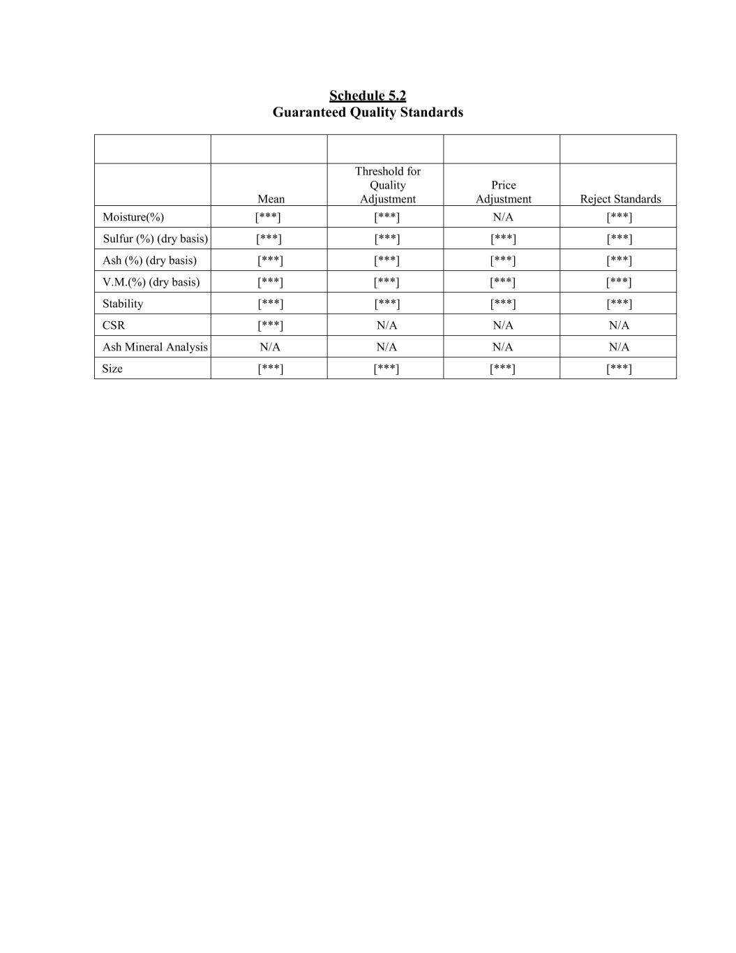 Schedule 5.2 Guaranteed Quality Standards Mean Threshold for Quality Adjustment Price Adjustment Reject Standards Moisture(%) [***] [***] N/A [***] Sulfur (%) (dry basis) [***] [***] [***] [***] Ash (%) (dry basis) [***] [***] [***] [***] V.M.(%) (dry basis) [***] [***] [***] [***] Stability [***] [***] [***] [***] CSR [***] N/A N/A N/A Ash Mineral Analysis N/A N/A N/A N/A Size [***] [***] [***] [***]