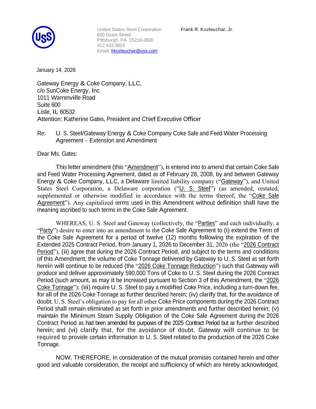 United States Steel Corporation Frank R. Kozleuchar, Jr. 600 Grant Street Pittsburgh, PA 15219-2800 412 433 3824 Email: frkozleuchar@uss.com January 14, 2026 Gateway Energy & Coke Company, LLC, c/o SunCoke Energy, Inc. 1011 Warrenville Road Suite 600 Lisle, IL 60532 Attention: Katherine Gates, President and Chief Executive Officer Re: U. S. Steel/Gateway Energy & Coke Company Coke Sale and Feed Water Processing Agreement – Extension and Amendment Dear Ms. Gates: This letter amendment (this “Amendment”), is entered into to amend that certain Coke Sale and Feed Water Processing Agreement, dated as of February 28, 2008, by and between Gateway Energy & Coke Company, LLC, a Delaware limited liability company (“Gateway”), and United States Steel Corporation, a Delaware corporation (“U. S. Steel”) (as amended, restated, supplemented or otherwise modified in accordance with the terms thereof, the “Coke Sale Agreement”). Any capitalized terms used in this Amendment without definition shall have the meaning ascribed to such terms in the Coke Sale Agreement. WHEREAS, U. S. Steel and Gateway (collectively, the “Parties” and each individually, a “Party”) desire to enter into an amendment to the Coke Sale Agreement to (i) extend the Term of the Coke Sale Agreement for a period of twelve (12) months following the expiration of the Extended 2025 Contract Period, from January 1, 2026 to December 31, 2026 (the “2026 Contract Period”), (ii) agree that during the 2026 Contract Period, and subject to the terms and conditions of this Amendment, the volume of Coke Tonnage delivered by Gateway to U. S. Steel as set forth herein will continue to be reduced (the “2026 Coke Tonnage Reduction”) such that Gateway will produce and deliver approximately 590,000 Tons of Coke to U. S. Steel during the 2026 Contract Period (such amount, as may it be increased pursuant to Section 3 of this Amendment, the “2026 Coke Tonnage”); (iii) require U. S. Steel to pay a modified Coke Price, including a turn-down fee, for all of the 2026 Coke Tonnage as further described herein; (iv) clarify that, for the avoidance of doubt, U. S. Steel’s obligation to pay for all other Coke Price components during the 2026 Contract Period shall remain eliminated as set forth in prior amendments and further described herein; (v) maintain the Minimum Steam Supply Obligation of the Coke Sale Agreement during the 2026 Contract Period as had been amended for purposes of the 2025 Contract Period but as further described herein; and (vi) clarify that, for the avoidance of doubt, Gateway will continue to be required to provide certain information to U. S. Steel related to the production of the 2026 Coke Tonnage. NOW, THEREFORE, in consideration of the mutual promises contained herein and other good and valuable consideration, the receipt and sufficiency of which are hereby acknowledged,
