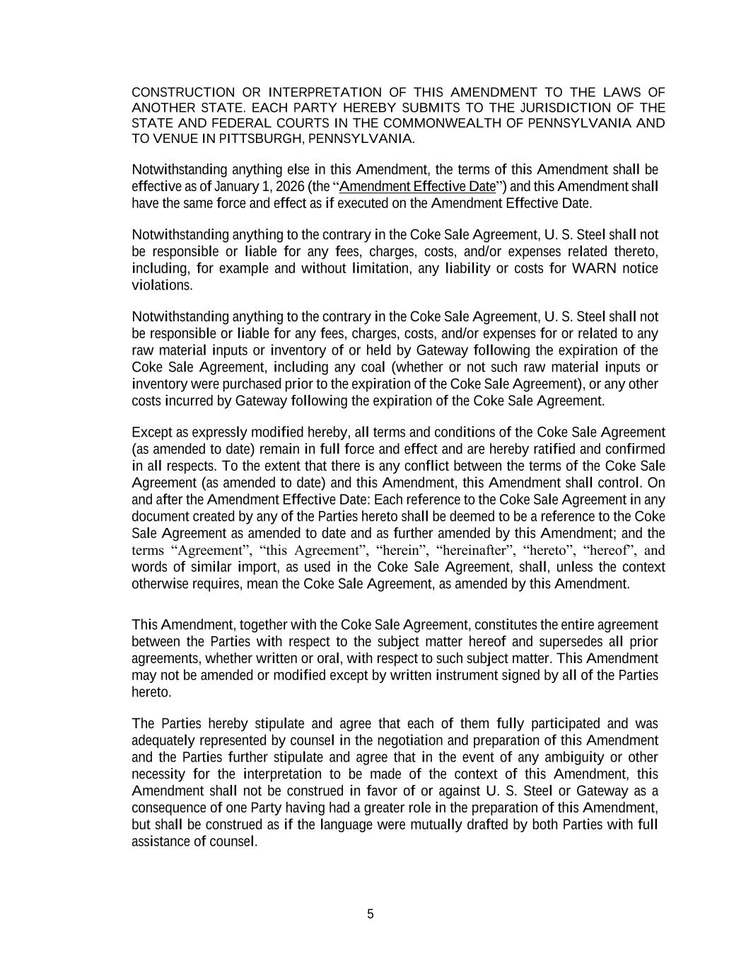 5 CONSTRUCTION OR INTERPRETATION OF THIS AMENDMENT TO THE LAWS OF ANOTHER STATE. EACH PARTY HEREBY SUBMITS TO THE JURISDICTION OF THE STATE AND FEDERAL COURTS IN THE COMMONWEALTH OF PENNSYLVANIA AND TO VENUE IN PITTSBURGH, PENNSYLVANIA. Notwithstanding anything else in this Amendment, the terms of this Amendment shall be effective as of January 1, 2026 (the “Amendment Effective Date”) and this Amendment shall have the same force and effect as if executed on the Amendment Effective Date. Notwithstanding anything to the contrary in the Coke Sale Agreement, U. S. Steel shall not be responsible or liable for any fees, charges, costs, and/or expenses related thereto, including, for example and without limitation, any liability or costs for WARN notice violations. Notwithstanding anything to the contrary in the Coke Sale Agreement, U. S. Steel shall not be responsible or liable for any fees, charges, costs, and/or expenses for or related to any raw material inputs or inventory of or held by Gateway following the expiration of the Coke Sale Agreement, including any coal (whether or not such raw material inputs or inventory were purchased prior to the expiration of the Coke Sale Agreement), or any other costs incurred by Gateway following the expiration of the Coke Sale Agreement. Except as expressly modified hereby, all terms and conditions of the Coke Sale Agreement (as amended to date) remain in full force and effect and are hereby ratified and confirmed in all respects. To the extent that there is any conflict between the terms of the Coke Sale Agreement (as amended to date) and this Amendment, this Amendment shall control. On and after the Amendment Effective Date: Each reference to the Coke Sale Agreement in any document created by any of the Parties hereto shall be deemed to be a reference to the Coke Sale Agreement as amended to date and as further amended by this Amendment; and the terms “Agreement”, “this Agreement”, “herein”, “hereinafter”, “hereto”, “hereof”, and words of similar import, as used in the Coke Sale Agreement, shall, unless the context otherwise requires, mean the Coke Sale Agreement, as amended by this Amendment. This Amendment, together with the Coke Sale Agreement, constitutes the entire agreement between the Parties with respect to the subject matter hereof and supersedes all prior agreements, whether written or oral, with respect to such subject matter. This Amendment may not be amended or modified except by written instrument signed by all of the Parties hereto. The Parties hereby stipulate and agree that each of them fully participated and was adequately represented by counsel in the negotiation and preparation of this Amendment and the Parties further stipulate and agree that in the event of any ambiguity or other necessity for the interpretation to be made of the context of this Amendment, this Amendment shall not be construed in favor of or against U. S. Steel or Gateway as a consequence of one Party having had a greater role in the preparation of this Amendment, but shall be construed as if the language were mutually drafted by both Parties with full assistance of counsel.