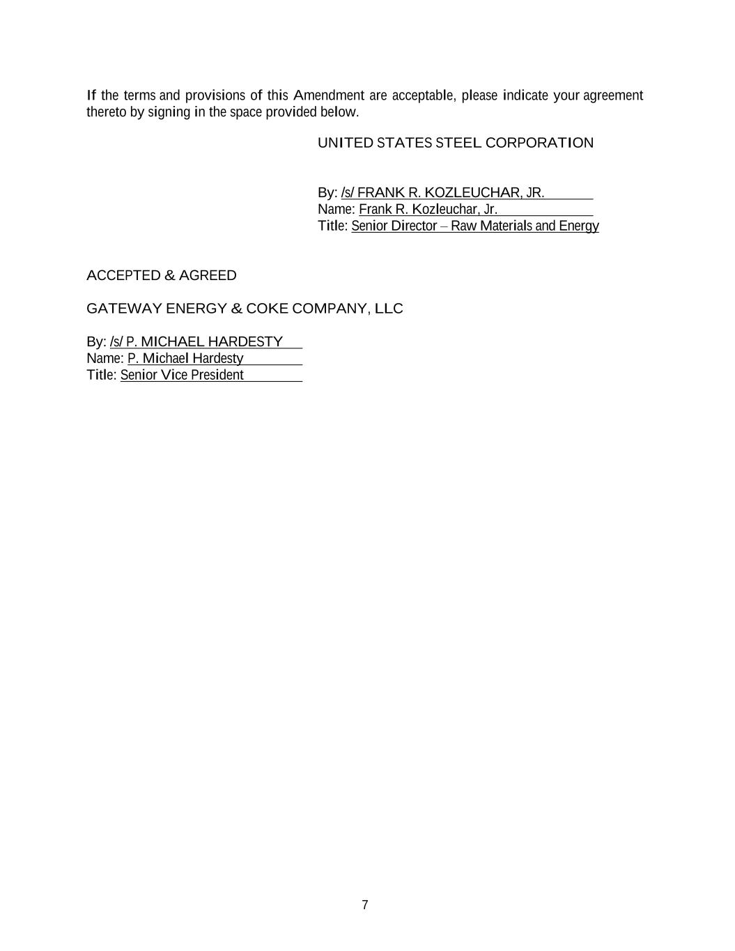 7 If the terms and provisions of this Amendment are acceptable, please indicate your agreement thereto by signing in the space provided below. UNITED STATES STEEL CORPORATION By: /s/ FRANK R. KOZLEUCHAR, JR. Name: Frank R. Kozleuchar, Jr. Title: Senior Director – Raw Materials and Energy ACCEPTED & AGREED GATEWAY ENERGY & COKE COMPANY, LLC By: /s/ P. MICHAEL HARDESTY Name: P. Michael Hardesty Title: Senior Vice President