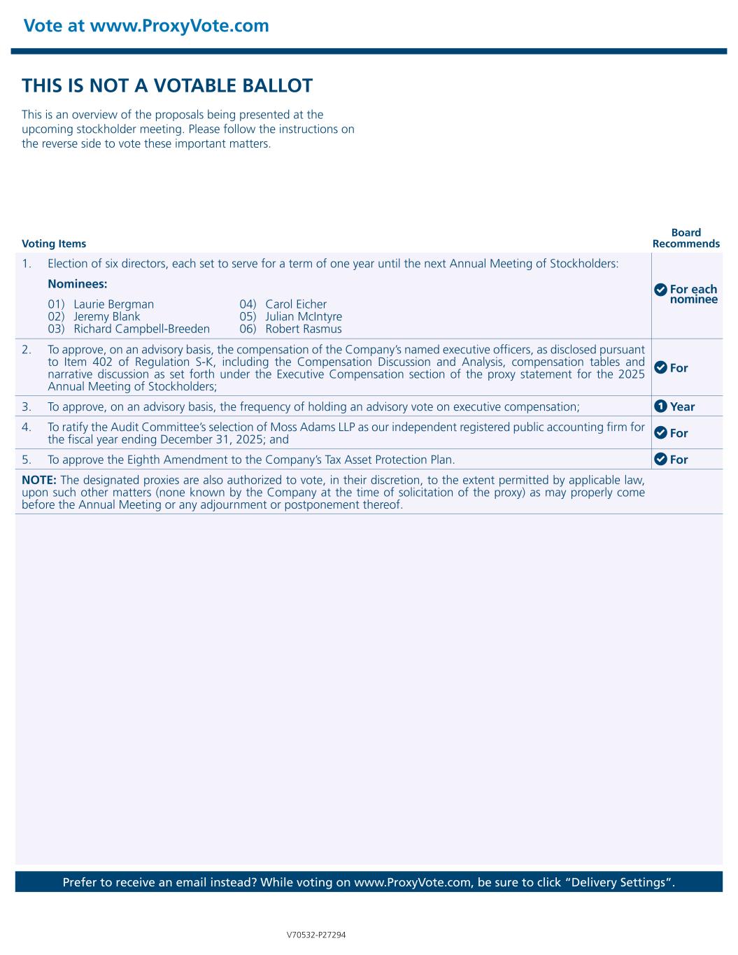 Vote at www.ProxyVote.com Prefer to receive an email instead? While voting on www.ProxyVote.com, be sure to click “Delivery Settings”. Voting Items Board Recommends V70532-P27294 THIS IS NOT A VOTABLE BALLOT This is an overview of the proposals being presented at the upcoming stockholder meeting. Please follow the instructions on the reverse side to vote these important matters. 1. Election of six directors, each set to serve for a term of one year until the next Annual Meeting of Stockholders: For each nominee Nominees: 01) Laurie Bergman 02) Jeremy Blank 03) Richard Campbell-Breeden 04) Carol Eicher 05) Julian McIntyre 06) Robert Rasmus 2. To approve, on an advisory basis, the compensation of the Company’s named executive officers, as disclosed pursuant to Item 402 of Regulation S-K, including the Compensation Discussion and Analysis, compensation tables and narrative discussion as set forth under the Executive Compensation section of the proxy statement for the 2025 Annual Meeting of Stockholders; For 3. To approve, on an advisory basis, the frequency of holding an advisory vote on executive compensation; 1 Year 4. To ratify the Audit Committee’s selection of Moss Adams LLP as our independent registered public accounting firm for the fiscal year ending December 31, 2025; and For 5. To approve the Eighth Amendment to the Company’s Tax Asset Protection Plan. For NOTE: The designated proxies are also authorized to vote, in their discretion, to the extent permitted by applicable law, upon such other matters (none known by the Company at the time of solicitation of the proxy) as may properly come before the Annual Meeting or any adjournment or postponement thereof.