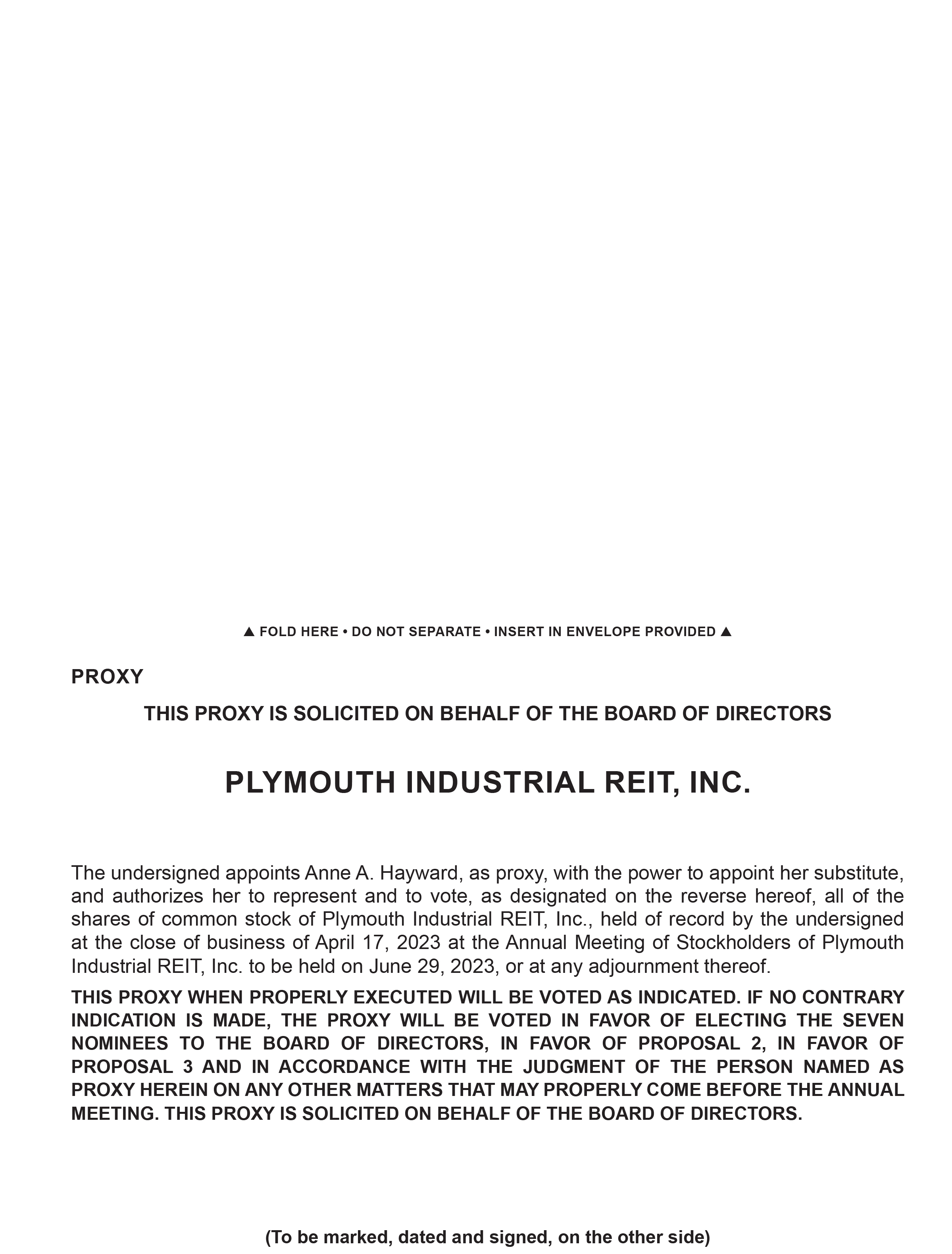 Our Board of Directors is soliciting your proxy to vote your shares of our common stock at the 2023 Annual Meeting of Stockholders because you owned shares of our common stock at the close of business on April 17, 2023, the record date for the annual meeting, and are therefore entitled to vote at the Annual Meeting. A Notice of Internet Availability of Proxy Materials, along with a proxy card, is being mailed on or about April 28, 2023 to stockholders of record as of April 17, 2023. We have made the Proxy Statement and 2022 Annual Report available to you on the Internet at the following address: www.plymouthreit.com. The proxy provides you with the opportunity to vote on the proposals presented at the Annual Meeting, whether or not you attend the meeting.