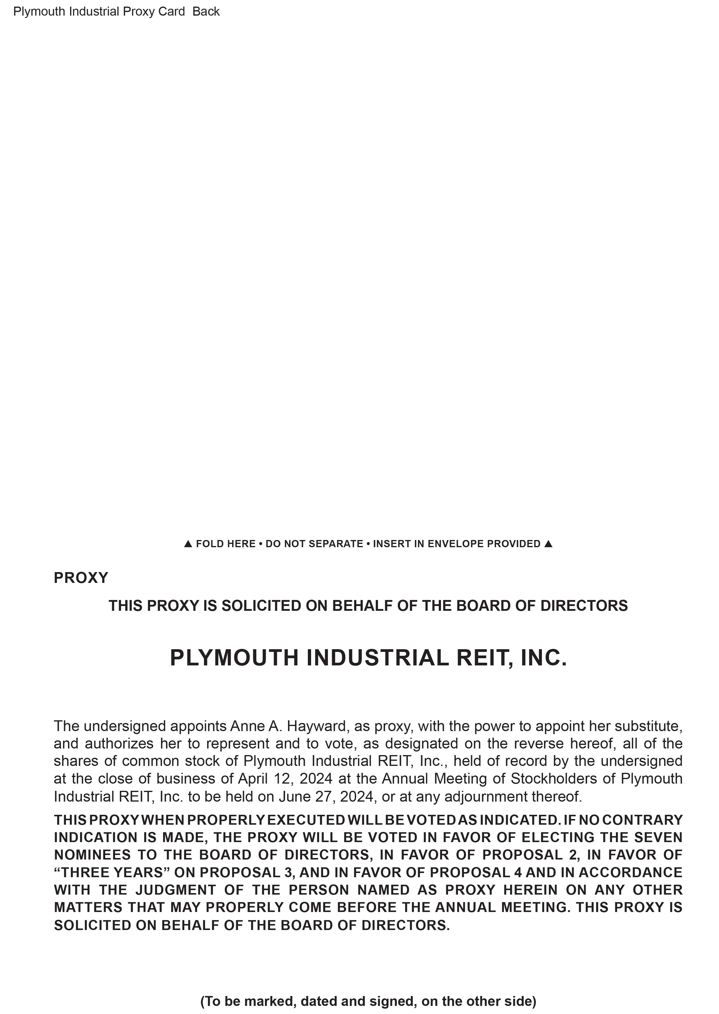 The undersigned appoints Anne A. Hayward, as proxy, with the power to appoint her substitute, and authorizes her to represent and to vote, as designated on the reverse hereof, all of the shares of common stock of Plymouth Industrial REIT, Inc., held of record by the undersigned at the close of business of April 12, 2024 at the Annual Meeting of Stockholders of Plymouth Industrial REIT, Inc. to be held on June 27, 2024, or at any adjournment thereof.
