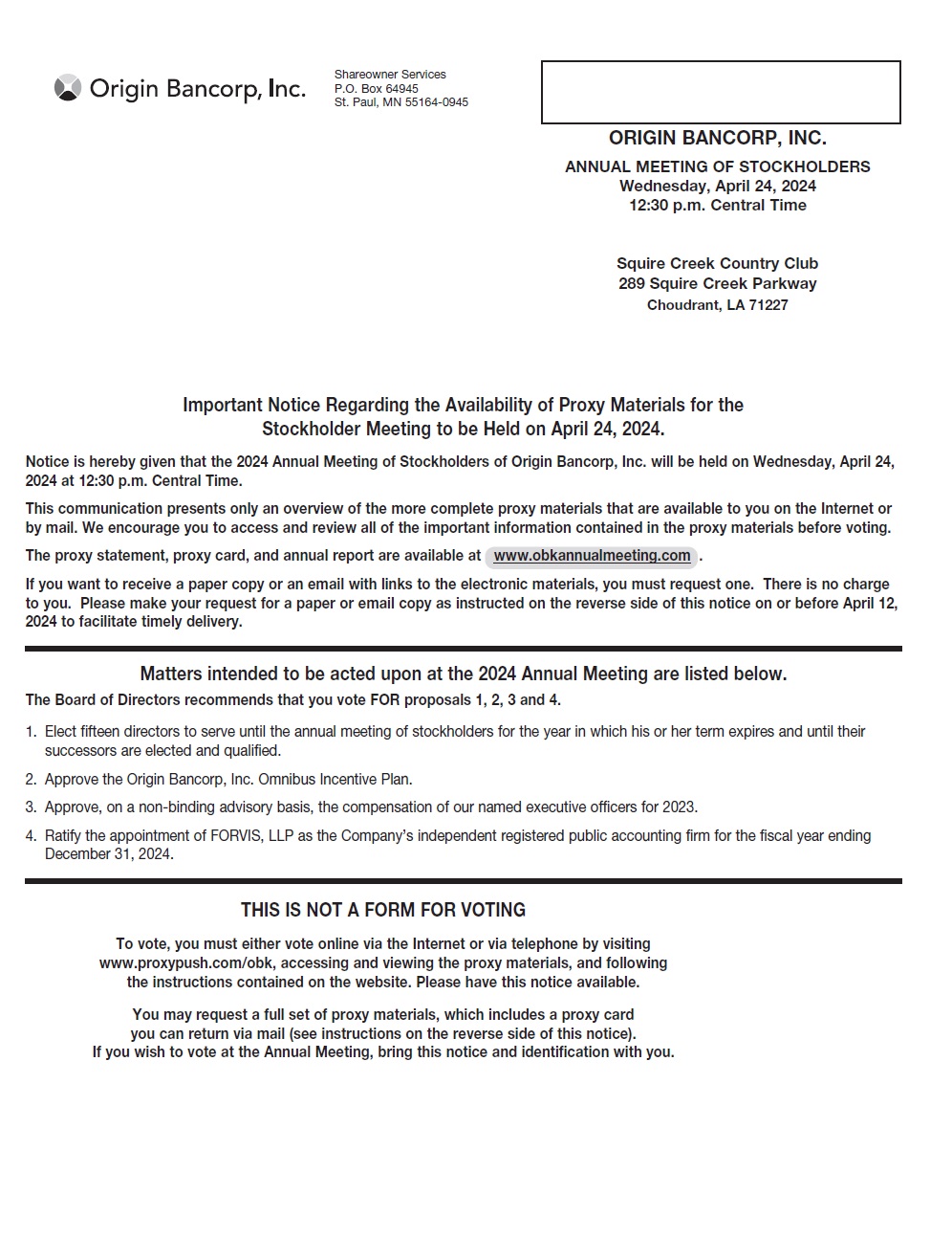ORIGIN BANCORP, INC. ANNUAL MEETING OF STOCKHOLDERS Wednesday, April 24, 2024 12:30 p.m. Central Time Squire Creek Country Club 289 Squire Creek Parkway Choudrant, LA 71227 Important Notice Regarding the Availability of Proxy Materials for the Stockholder Meeting to be Held on April 24, 2024. Notice is hereby given that the 2024 Annual Meeting of Stockholders of Origin Bancorp, Inc. will be held on Wednesday, April 24, 2024 at 12:30 p.m. Central Time. This communication presents only an overview of the more complete proxy materials that are available to you on the Internet or by mail. We encourage you to access and review all of the important information contained in the proxy materials before voting. The proxy statement, proxy card, and annual report are available at www.obkannualmeeting.com . If you want to receive a paper copy or an email with links to the electronic materials, you must request one. There is no charge to you. Please make your request for a paper or email copy as instructed on the reverse side of this notice on or before April 12, 2024 to facilitate timely delivery. Matters intended to be acted upon at the 2024 Annual Meeting are listed below. The Board of Directors recommends that you vote FOR proposals 1, 2, 3 and 4. 1. Elect fifteen directors to serve until the annual meeting of stockholders for the year in which his or her term expires and until their successors are elected and qualified. 2. Approve the Origin Bancorp, Inc. Omnibus Incentive Plan. 3. Approve, on a non-binding advisory basis, the compensation of our named executive officers for 2023. 4. Ratify the appointment of FORVIS, LLP as the Company’s independent registered public accounting firm for the fiscal year ending December 31, 2024. THIS IS NOT A FORM FOR VOTING To vote, you must either vote online via the Internet or via telephone by visiting www.proxypush.com/obk, accessing and viewing the proxy materials, and following the instructions contained on the website. Please have this notice available. Scan code to the right for mobile voting. You may request a full set of proxy materials, which includes a proxy card you can return via mail (see instructions on the reverse side of this notice). If you wish to vote at the Annual Meeting, bring this notice and identification with you. Shareowner Services P.O. Box 64945 St. Paul, MN 55164-0945