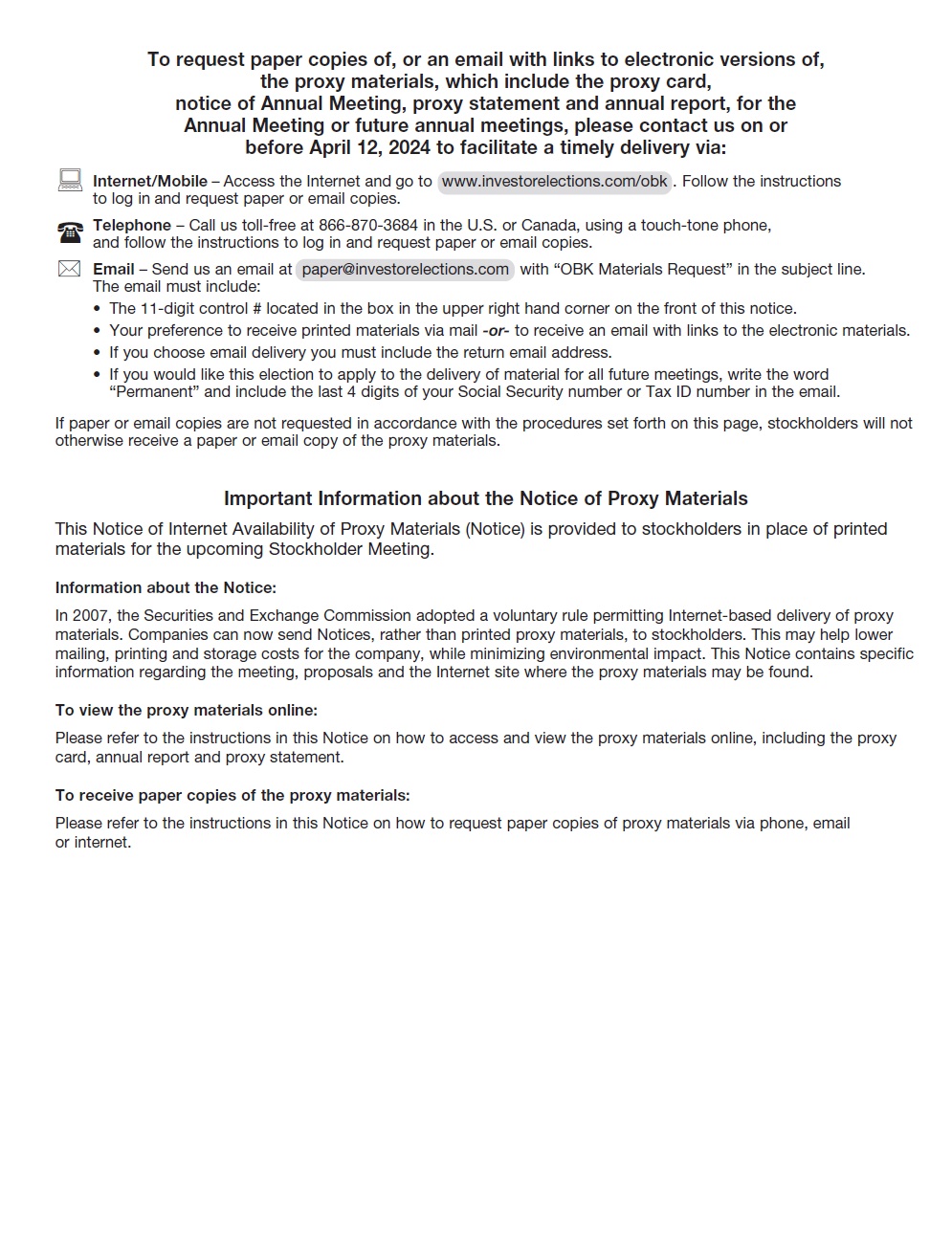 To request paper copies of, or an email with links to electronic versions of, the proxy materials, which include the proxy card, notice of Annual Meeting, proxy statement and annual report, for the Annual Meeting or future annual meetings, please contact us on or before April 12, 2024 to facilitate a timely delivery via: : Internet/Mobile – Access the Internet and go to www.investorelections.com/obk .. Follow the instructions to log in and request paper or email copies. (Telephone – Call us toll-free at 866-870-3684 in the U.S. or Canada, using a touch-tone phone, and follow the instructions to log in and request paper or email copies. * Email – Send us an email at paper@investorelections.com with “OBK Materials Request” in the subject line. The email must include: • The 11-digit control # located in the box in the upper right hand corner on the front of this notice. • Your preference to receive printed materials via mail -or- to receive an email with links to the electronic materials. • If you choose email delivery you must include the return email address. • If you would like this election to apply to the delivery of material for all future meetings, write the word “Permanent” and include the last 4 digits of your Social Security number or Tax ID number in the email. If paper or email copies are not requested in accordance with the procedures set forth on this page, stockholders will not otherwise receive a paper or email copy of the proxy materials. Important Information about the Notice of Proxy Materials This Notice of Internet Availability of Proxy Materials (Notice) is provided to stockholders in place of printed materials for the upcoming Stockholder Meeting. Information about the Notice: In 2007, the Securities and Exchange Commission adopted a voluntary rule permitting Internet-based delivery of proxy materials. Companies can now send Notices, rather than printed proxy materials, to stockholders. This may help lower mailing, printing and storage costs for the company, while minimizing environmental impact. This Notice contains specific information regarding the meeting, proposals and the Internet site where the proxy materials may be found. To view the proxy materials online: Please refer to the instructions in this Notice on how to access and view the proxy materials online, including the proxy card, annual report and proxy statement. To receive paper copies of the proxy materials: Please refer to the instructions in this Notice on how to request paper copies of proxy materials via phone, email or internet.