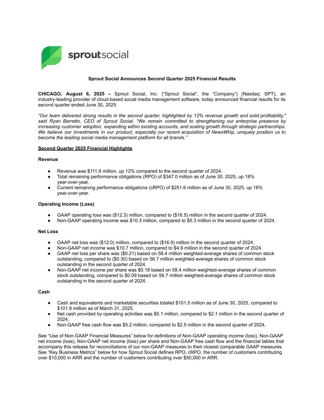 Sprout Social Announces Second Quarter 2025 Financial Results CHICAGO, August 6, 2025 – Sprout Social, Inc. (“Sprout Social”, the “Company”) (Nasdaq: SPT), an industry-leading provider of cloud-based social media management software, today announced financial results for its second quarter ended June 30, 2025. “Our team delivered strong results in the second quarter, highlighted by 12% revenue growth and solid profitability," said Ryan Barretto, CEO of Sprout Social. “We remain committed to strengthening our enterprise presence by increasing customer adoption, expanding within existing accounts, and scaling growth through strategic partnerships. We believe our investments in our product, especially our recent acquisition of NewsWhip, uniquely position us to become the leading social media management platform for all brands.” Second Quarter 2025 Financial Highlights Revenue ● Revenue was $111.8 million, up 12% compared to the second quarter of 2024. ● Total remaining performance obligations (RPO) of $347.0 million as of June 30, 2025, up 18% year-over-year. ● Current remaining performance obligations (cRPO) of $251.6 million as of June 30, 2025, up 18% year-over-year. Operating Income (Loss) ● GAAP operating loss was ($12.3) million, compared to ($16.5) million in the second quarter of 2024. ● Non-GAAP operating income was $10.3 million, compared to $5.3 million in the second quarter of 2024. Net Loss ● GAAP net loss was ($12.0) million, compared to ($16.9) million in the second quarter of 2024. ● Non-GAAP net income was $10.7 million, compared to $4.9 million in the second quarter of 2024. ● GAAP net loss per share was ($0.21) based on 58.4 million weighted-average shares of common stock outstanding, compared to ($0.30) based on 56.7 million weighted-average shares of common stock outstanding in the second quarter of 2024. ● Non-GAAP net income per share was $0.18 based on 58.4 million weighted-average shares of common stock outstanding, compared to $0.09 based on 56.7 million weighted-average shares of common stock outstanding in the second quarter of 2024. Cash ● Cash and equivalents and marketable securities totaled $101.5 million as of June 30, 2025, compared to $101.9 million as of March 31, 2025. ● Net cash provided by operating activities was $5.1 million, compared to $2.1 million in the second quarter of 2024. ● Non-GAAP free cash flow was $5.2 million, compared to $2.5 million in the second quarter of 2024. See “Use of Non-GAAP Financial Measures” below for definitions of Non-GAAP operating income (loss), Non-GAAP net income (loss), Non-GAAP net income (loss) per share and Non-GAAP free cash flow and the financial tables that accompany this release for reconciliations of our non-GAAP measures to their closest comparable GAAP measures. See “Key Business Metrics” below for how Sprout Social defines RPO, cRPO, the number of customers contributing over $10,000 in ARR and the number of customers contributing over $50,000 in ARR.