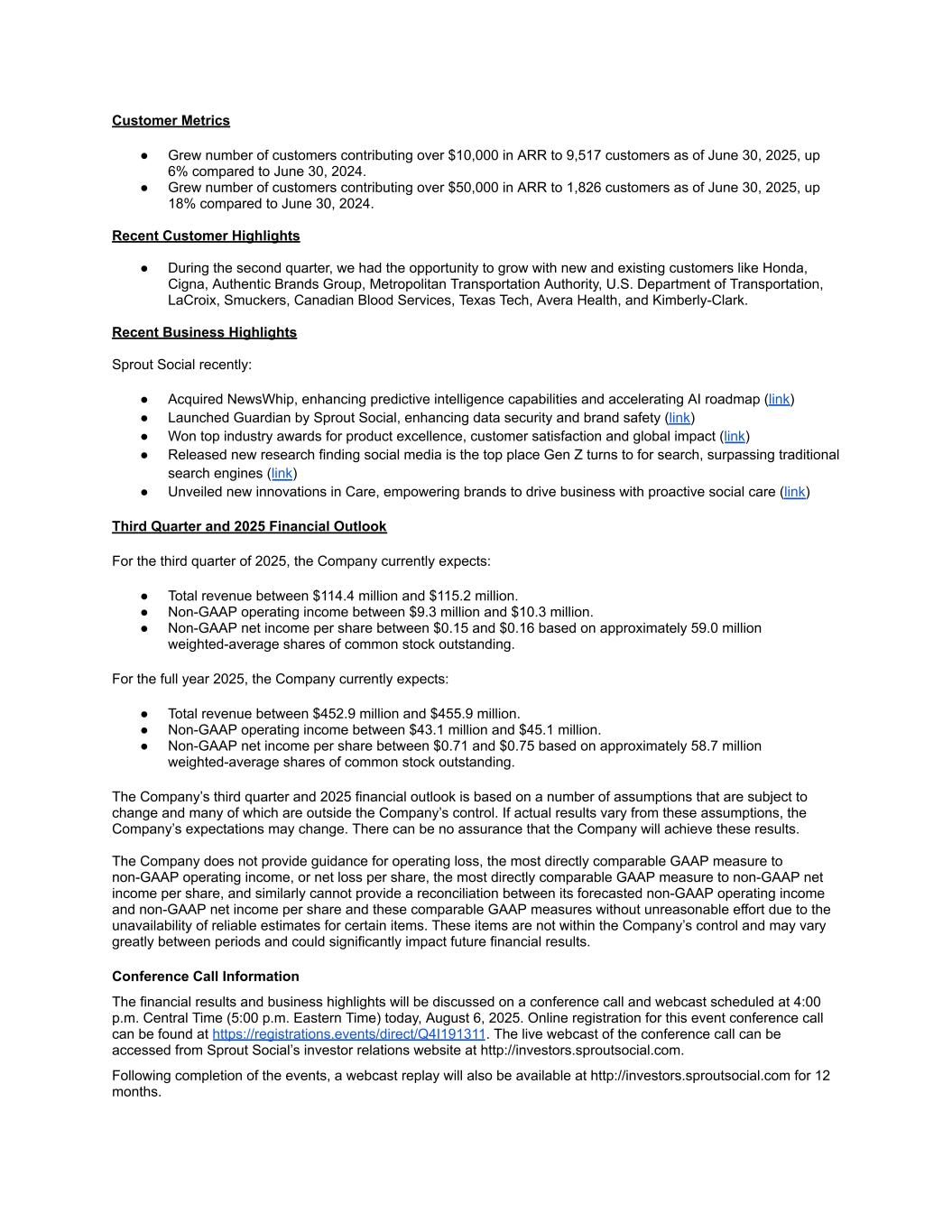 Customer Metrics ● Grew number of customers contributing over $10,000 in ARR to 9,517 customers as of June 30, 2025, up 6% compared to June 30, 2024. ● Grew number of customers contributing over $50,000 in ARR to 1,826 customers as of June 30, 2025, up 18% compared to June 30, 2024. Recent Customer Highlights ● During the second quarter, we had the opportunity to grow with new and existing customers like Honda, Cigna, Authentic Brands Group, Metropolitan Transportation Authority, U.S. Department of Transportation, LaCroix, Smuckers, Canadian Blood Services, Texas Tech, Avera Health, and Kimberly-Clark. Recent Business Highlights Sprout Social recently: ● Acquired NewsWhip, enhancing predictive intelligence capabilities and accelerating AI roadmap (link) ● Launched Guardian by Sprout Social, enhancing data security and brand safety (link) ● Won top industry awards for product excellence, customer satisfaction and global impact (link) ● Released new research finding social media is the top place Gen Z turns to for search, surpassing traditional search engines (link) ● Unveiled new innovations in Care, empowering brands to drive business with proactive social care (link) Third Quarter and 2025 Financial Outlook For the third quarter of 2025, the Company currently expects: ● Total revenue between $114.4 million and $115.2 million. ● Non-GAAP operating income between $9.3 million and $10.3 million. ● Non-GAAP net income per share between $0.15 and $0.16 based on approximately 59.0 million weighted-average shares of common stock outstanding. For the full year 2025, the Company currently expects: ● Total revenue between $452.9 million and $455.9 million. ● Non-GAAP operating income between $43.1 million and $45.1 million. ● Non-GAAP net income per share between $0.71 and $0.75 based on approximately 58.7 million weighted-average shares of common stock outstanding. The Company’s third quarter and 2025 financial outlook is based on a number of assumptions that are subject to change and many of which are outside the Company’s control. If actual results vary from these assumptions, the Company’s expectations may change. There can be no assurance that the Company will achieve these results. The Company does not provide guidance for operating loss, the most directly comparable GAAP measure to non-GAAP operating income, or net loss per share, the most directly comparable GAAP measure to non-GAAP net income per share, and similarly cannot provide a reconciliation between its forecasted non-GAAP operating income and non-GAAP net income per share and these comparable GAAP measures without unreasonable effort due to the unavailability of reliable estimates for certain items. These items are not within the Company’s control and may vary greatly between periods and could significantly impact future financial results. Conference Call Information The financial results and business highlights will be discussed on a conference call and webcast scheduled at 4:00 p.m. Central Time (5:00 p.m. Eastern Time) today, August 6, 2025. Online registration for this event conference call can be found at https://registrations.events/direct/Q4I191311. The live webcast of the conference call can be accessed from Sprout Social’s investor relations website at http://investors.sproutsocial.com. Following completion of the events, a webcast replay will also be available at http://investors.sproutsocial.com for 12 months.