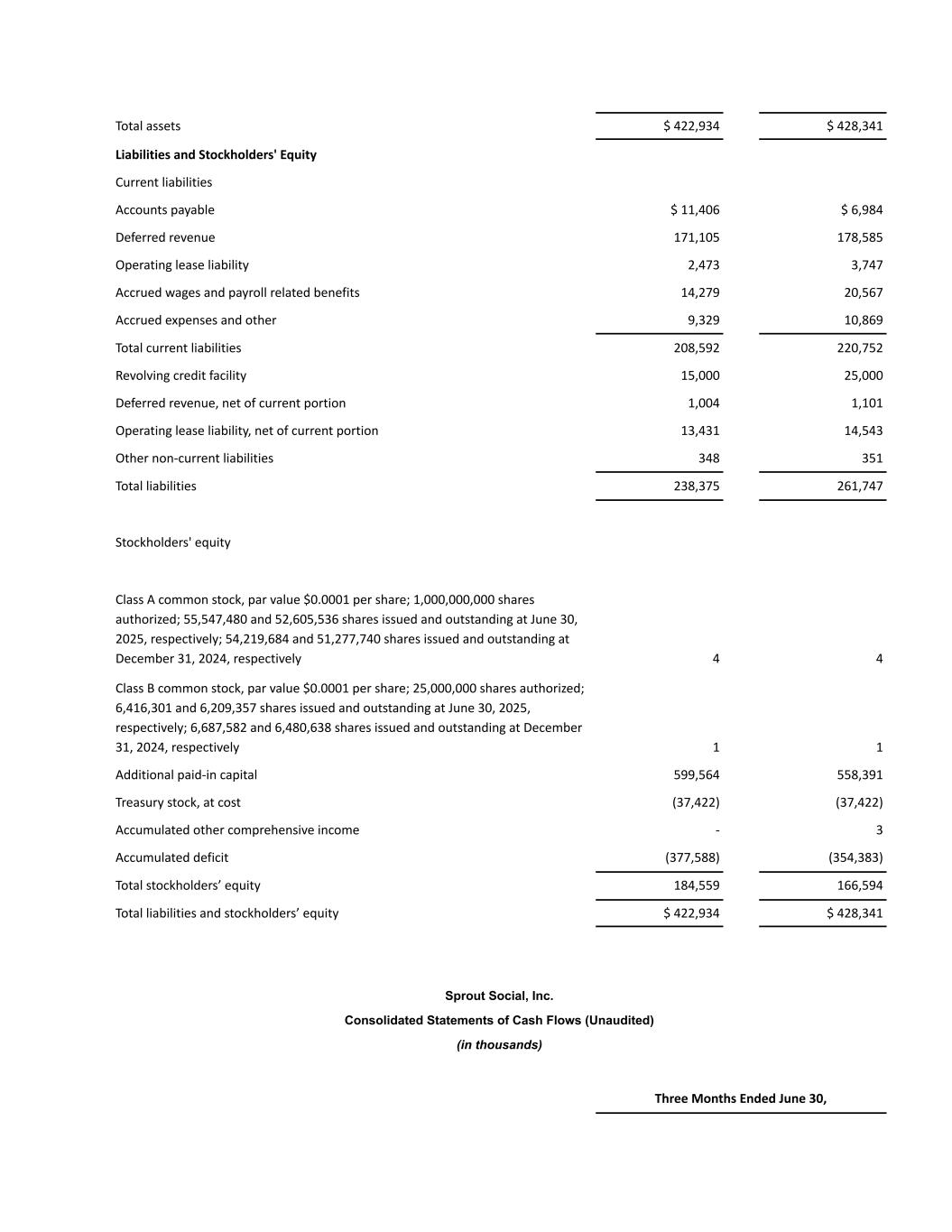 Total assets $ 422,934 $ 428,341 Liabilities and Stockholders' Equity Current liabilities Accounts payable $ 11,406 $ 6,984 Deferred revenue 171,105 178,585 Operating lease liability 2,473 3,747 Accrued wages and payroll related benefits 14,279 20,567 Accrued expenses and other 9,329 10,869 Total current liabilities 208,592 220,752 Revolving credit facility 15,000 25,000 Deferred revenue, net of current portion 1,004 1,101 Operating lease liability, net of current portion 13,431 14,543 Other non-current liabilities 348 351 Total liabilities 238,375 261,747 Stockholders' equity Class A common stock, par value $0.0001 per share; 1,000,000,000 shares authorized; 55,547,480 and 52,605,536 shares issued and outstanding at June 30, 2025, respectively; 54,219,684 and 51,277,740 shares issued and outstanding at December 31, 2024, respectively 4 4 Class B common stock, par value $0.0001 per share; 25,000,000 shares authorized; 6,416,301 and 6,209,357 shares issued and outstanding at June 30, 2025, respectively; 6,687,582 and 6,480,638 shares issued and outstanding at December 31, 2024, respectively 1 1 Additional paid-in capital 599,564 558,391 Treasury stock, at cost (37,422) (37,422) Accumulated other comprehensive income - 3 Accumulated deficit (377,588) (354,383) Total stockholders’ equity 184,559 166,594 Total liabilities and stockholders’ equity $ 422,934 $ 428,341 Sprout Social, Inc. Consolidated Statements of Cash Flows (Unaudited) (in thousands) Three Months Ended June 30,