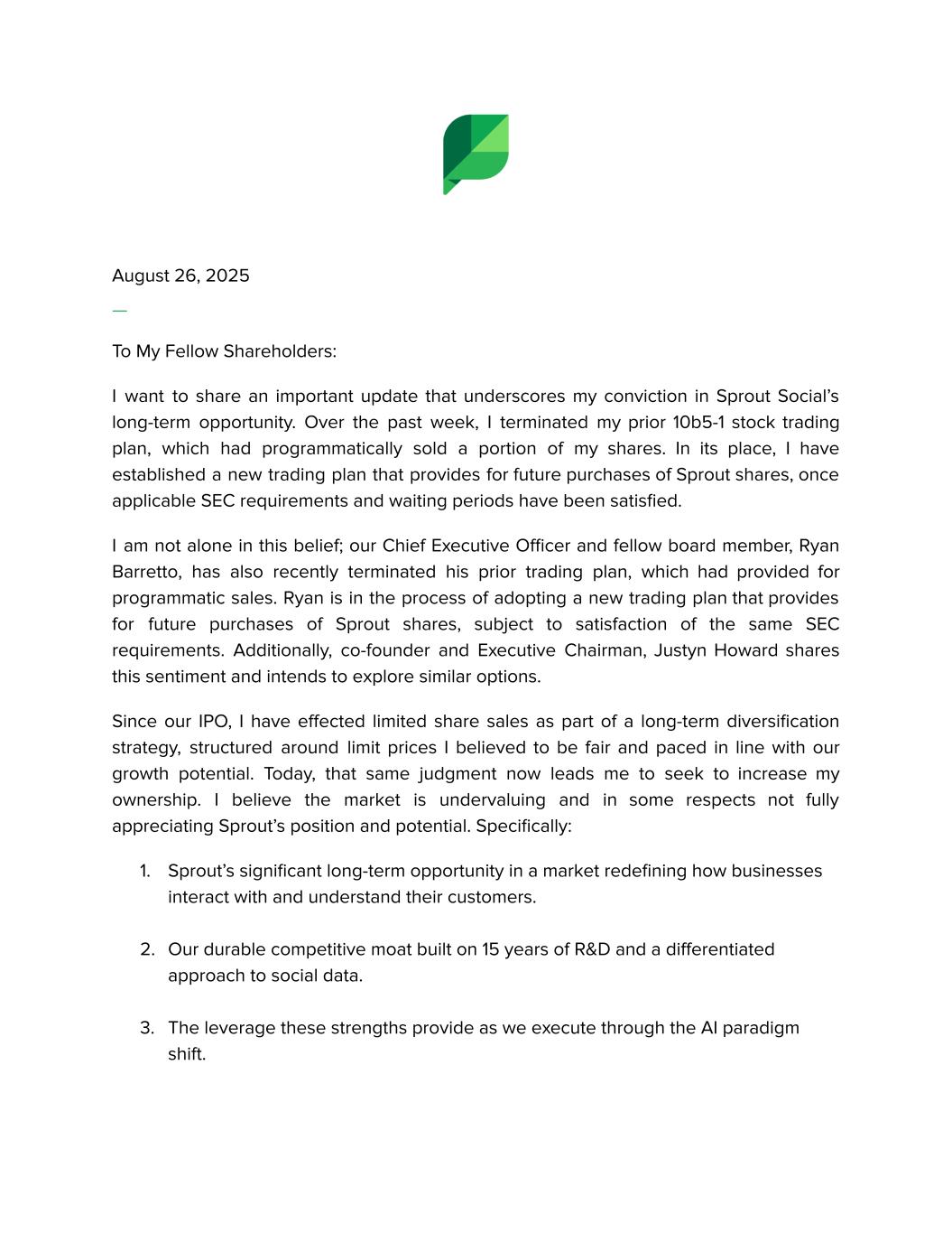 August 26, 2025 — To My Fellow Shareholders: I want to share an important update that underscores my conviction in Sprout Social’s long-term opportunity. Over the past week, I terminated my prior 10b5-1 stock trading plan, which had programmatically sold a portion of my shares. In its place, I have established a new trading plan that provides for future purchases of Sprout shares, once applicable SEC requirements and waiting periods have been satisfied. I am not alone in this belief; our Chief Executive Officer and fellow board member, Ryan Barretto, has also recently terminated his prior trading plan, which had provided for programmatic sales. Ryan is in the process of adopting a new trading plan that provides for future purchases of Sprout shares, subject to satisfaction of the same SEC requirements. Additionally, co-founder and Executive Chairman, Justyn Howard shares this sentiment and intends to explore similar options. Since our IPO, I have effected limited share sales as part of a long-term diversification strategy, structured around limit prices I believed to be fair and paced in line with our growth potential. Today, that same judgment now leads me to seek to increase my ownership. I believe the market is undervaluing and in some respects not fully appreciating Sprout’s position and potential. Specifically: 1. Sprout’s significant long-term opportunity in a market redefining how businesses interact with and understand their customers. 2. Our durable competitive moat built on 15 years of R&D and a differentiated approach to social data. 3. The leverage these strengths provide as we execute through the AI paradigm shift.